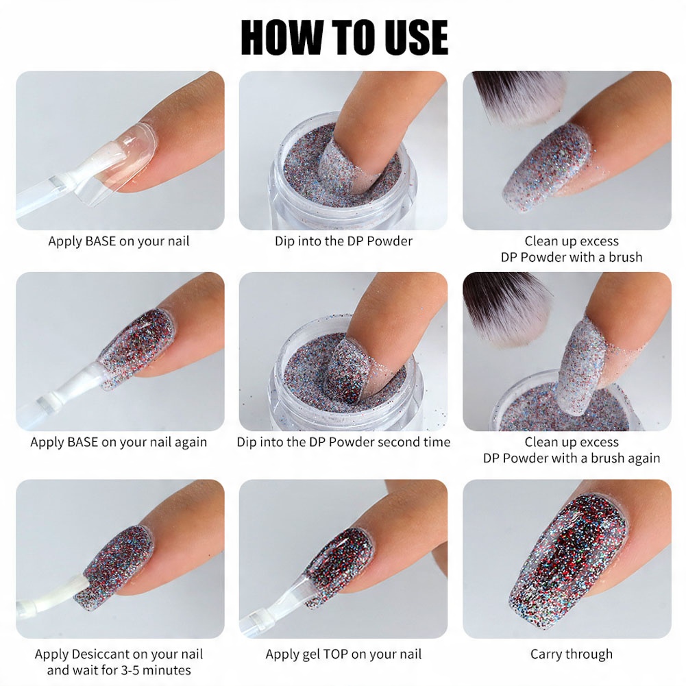 3: Нанесите второй слой основания, быстро увлажняйте гвоздь цветным порошком.