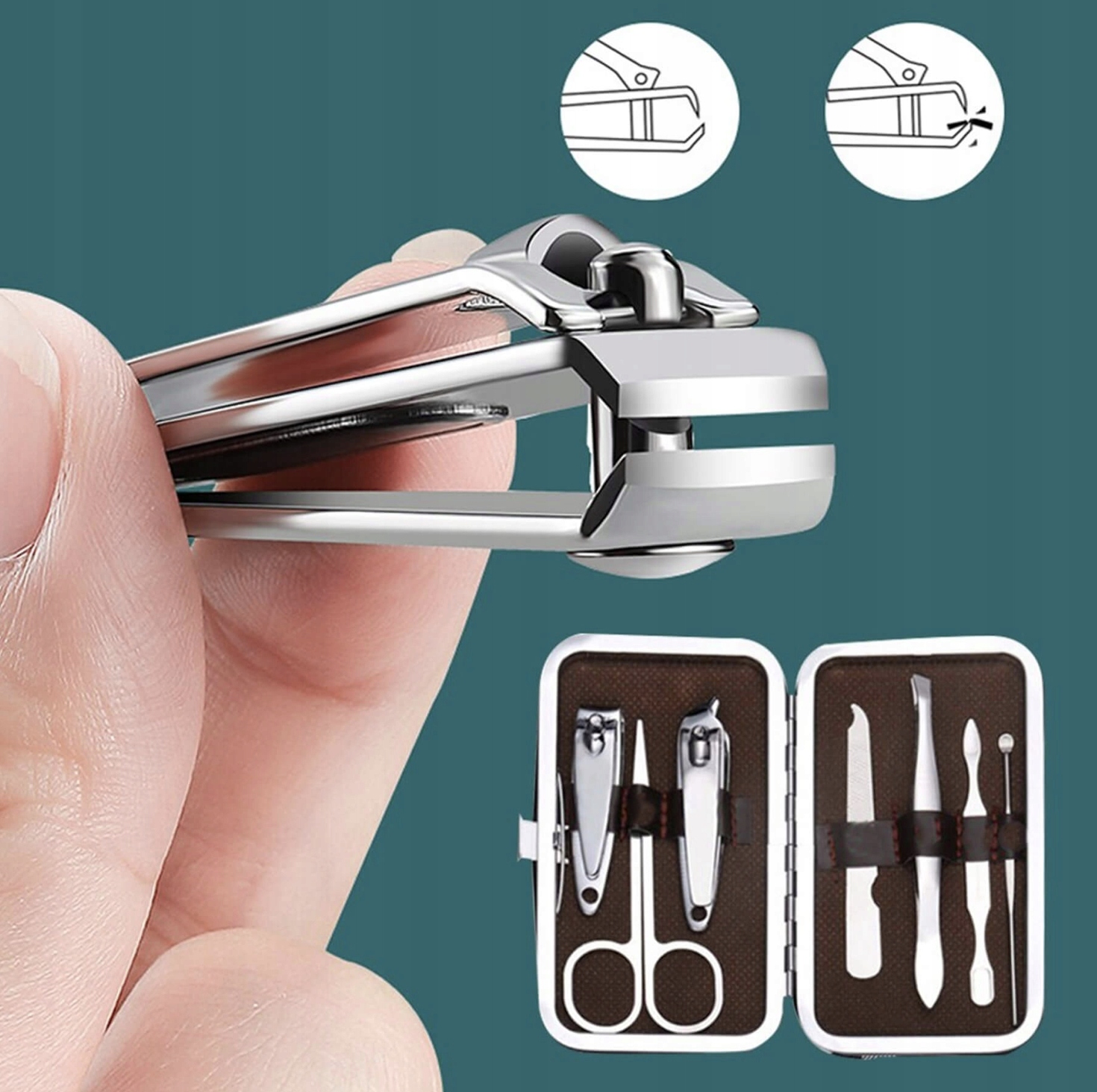 Маникюрный набор состоит из 7 элементов, благодаря которым мы можем ухаживать за ногтями на руках и ногах. В набор входят ножницы и кусачки для ногтей, которые эффективно укоротят ногти. Боковые кусачки используются для обрезки твердых ногтей или обрезки кутикулы, которую можно отодвинуть с помощью накатки, входящей в комплект. В комплект поставки также входит пилочка для быстрого выравнивания ногтей. Входящий в комплект пинцет позволит вам легко удалить нежелательные волосы с лица.