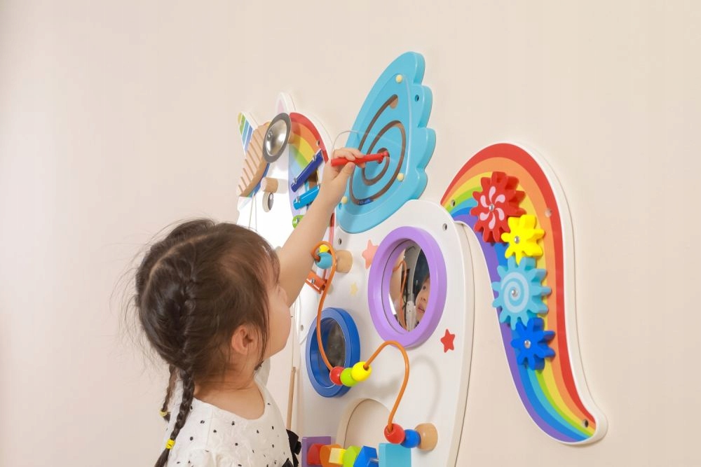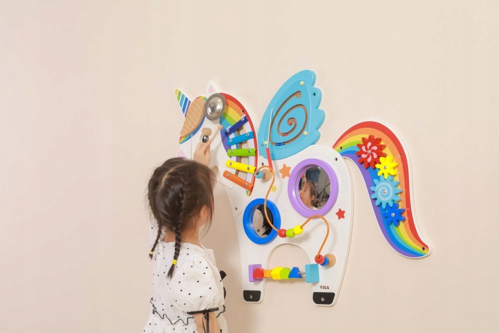 Панель подвешивается на стену на подходящей для ребенка высоте, что позволяет получать бесконечное удовольствие. Что не менее важно, единорог станет красивым украшением стены и всегда будет на своем месте. Благодаря своим функциям и внешнему виду она также будет хорошо работать везде, где приходят дети: залы ожидания, поликлиники, школы и научные корпуса, закрытые игровые площадки или детские уголки в ресторанах – вариантов применения этой игрушки множество.