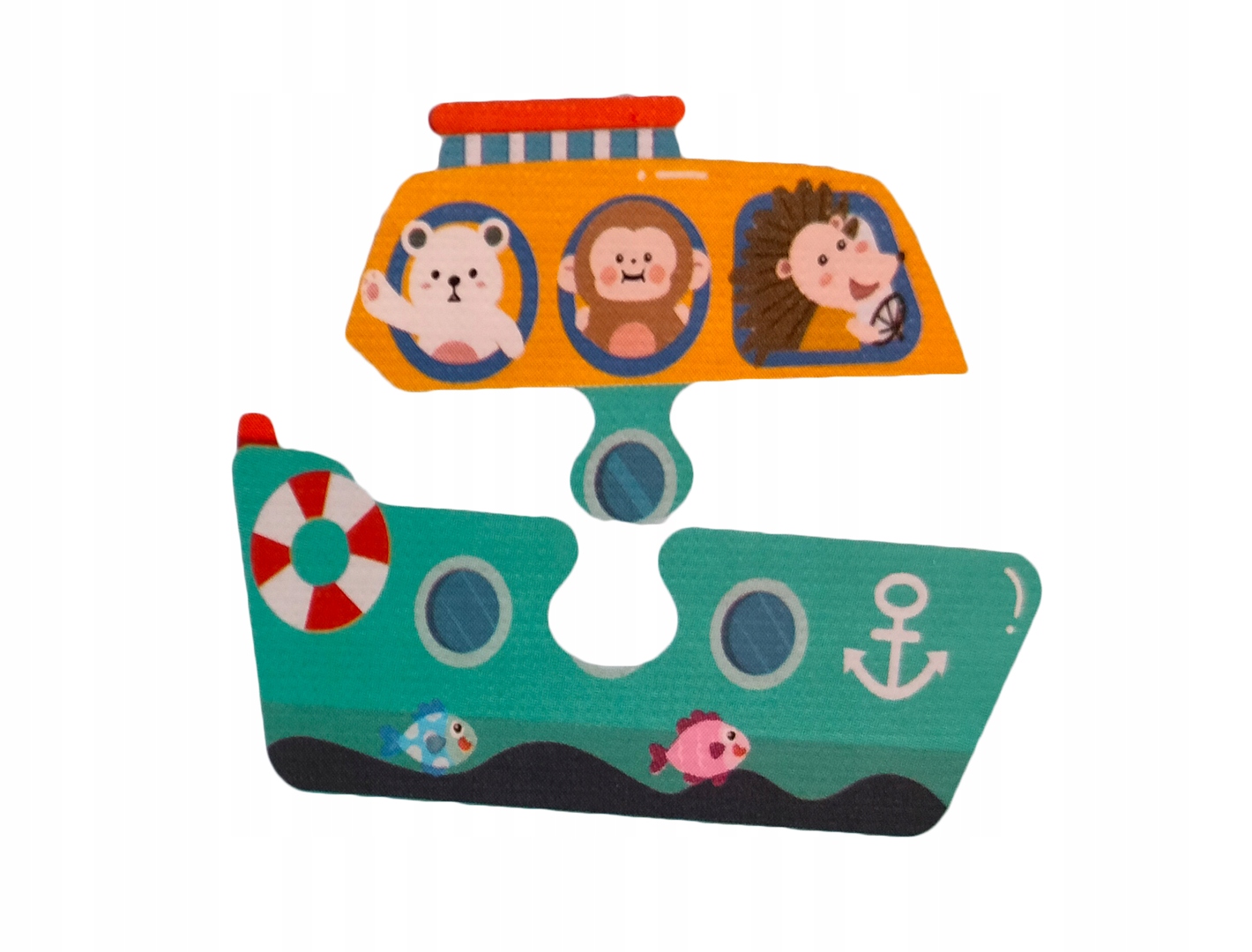 В набор входят разноцветные рыбки, транспортные средства, фигуры, которые необходимо подобрать к соответствующим отверстия.