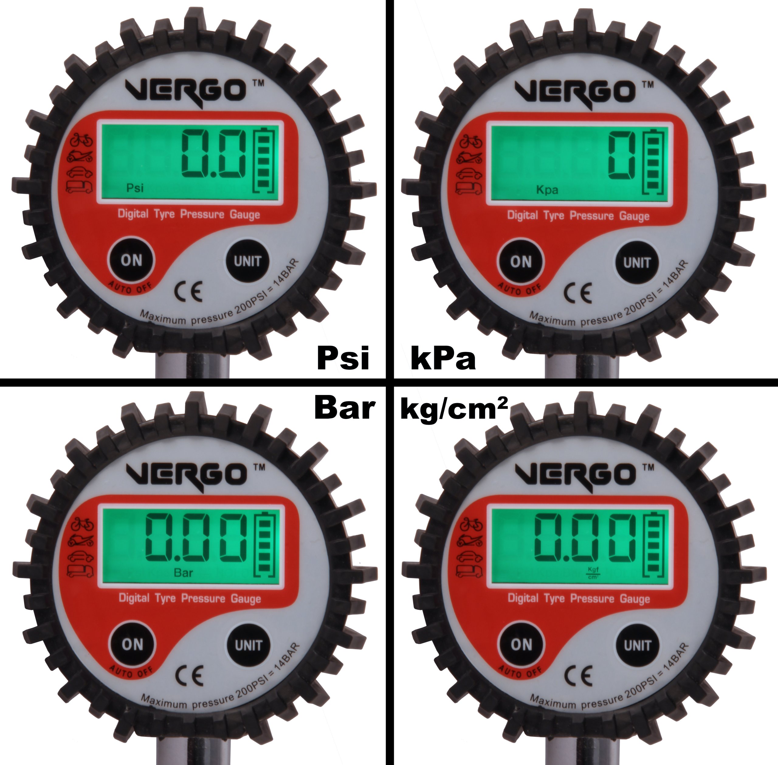 Просто нажмите кнопку «UNIT», чтобы изменить единицу измерения: фунты на квадратный дюйм, кПа, бар или кг/см^2.