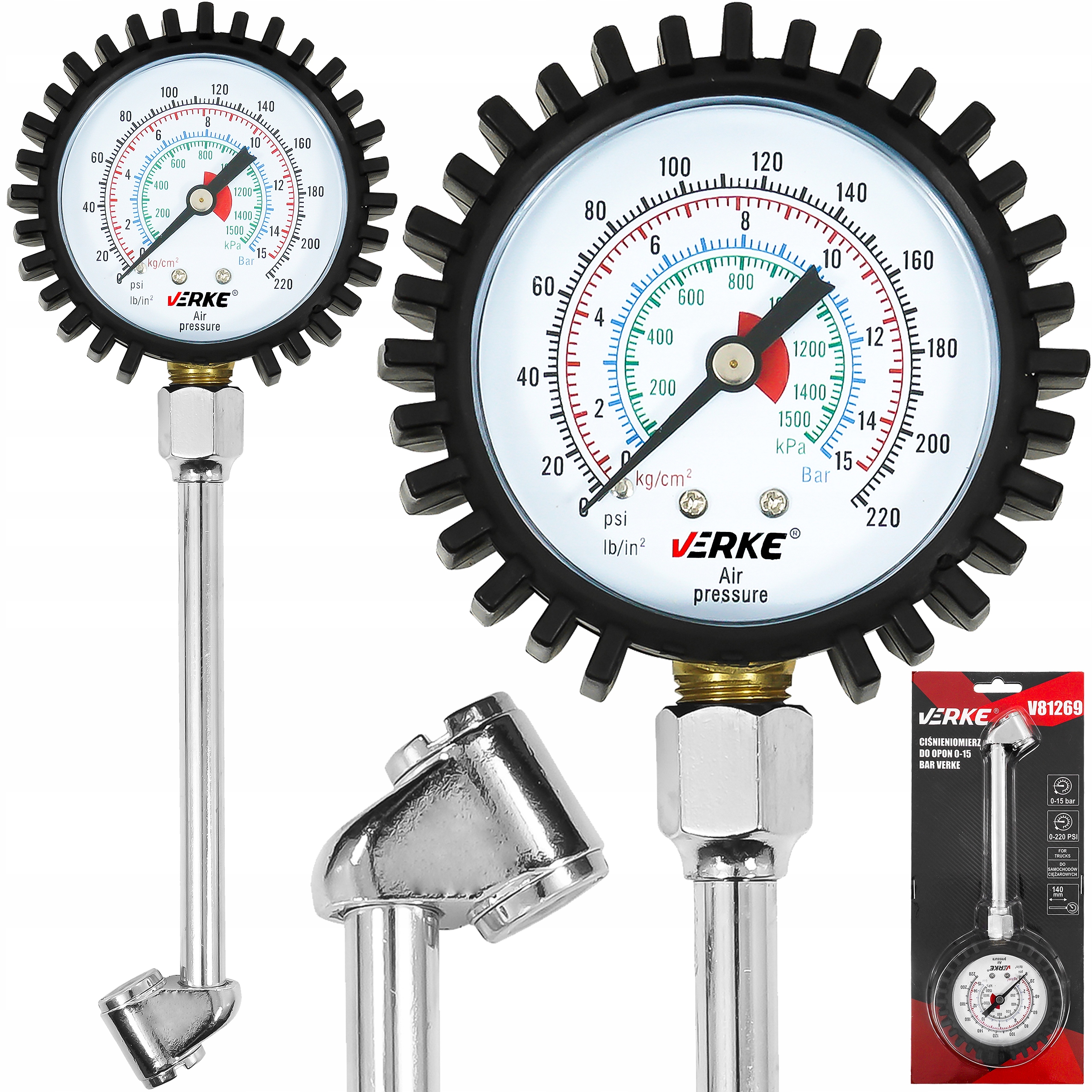 - Тонометр из металла с диапазоном давления 0–15 Бар. Универсальный прибор для измерения воздуха в шинах.