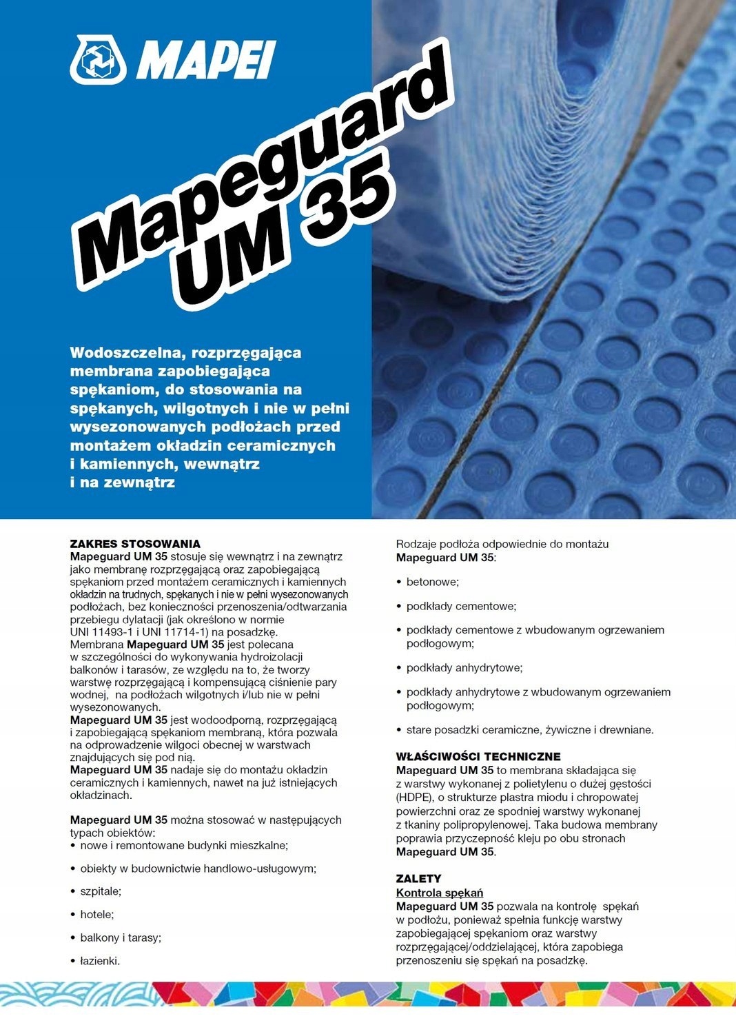 Mapeguard UM35 — подплиточная герметизирующая и разъединяющая мембрана, предотвращающая появление трещин, изготовленная из полиэтилена высокой плотности (HDPE) и полипропиленового нетканого материала специальной сотовой формы. Используется перед монтажом керамической и каменной облицовки внутри и снаружи.