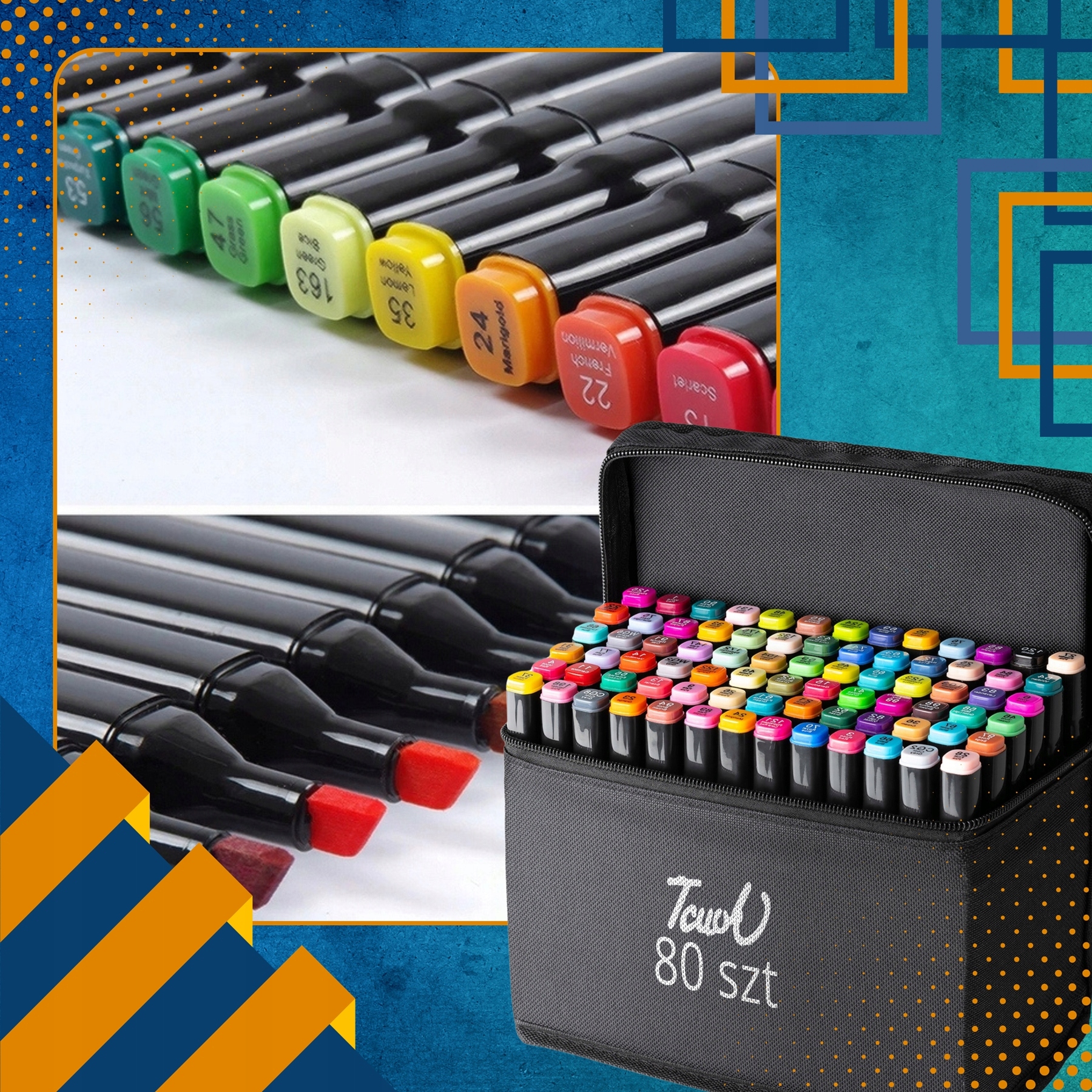 Набор из 80 двусторонних спиртовых маркеров в элегантной сумке — идеальный инструмент для каждого художника. Богатая цветовая палитра, эргономичная форма и нетоксичные чернила гарантируют универсальность, комфорт и безопасность.