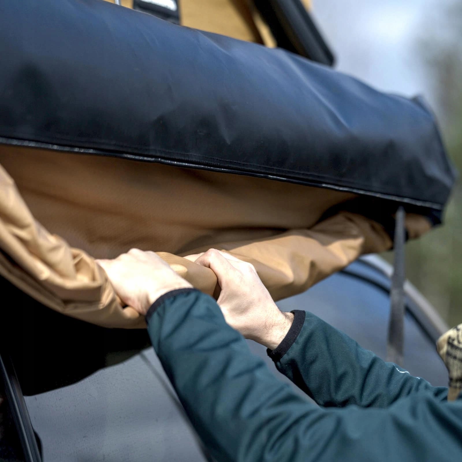 Атент сложен и скрыт в увеличенном случае, сделанном из прочного ПВХ, который не только защищает кровлю от повреждения и грязи, но и облегчает его быстрое складывание и скрывает материал в крышке. Мы предсказали дополнительное место внутри обложки для столбов и меньших брезентов или стены Uniwall от оффлэнда. Все может поместиться без проблем на обложке. Более широкий материал из ПВХ не шумит во время путешествия и, конечно, облегчает упаковку.