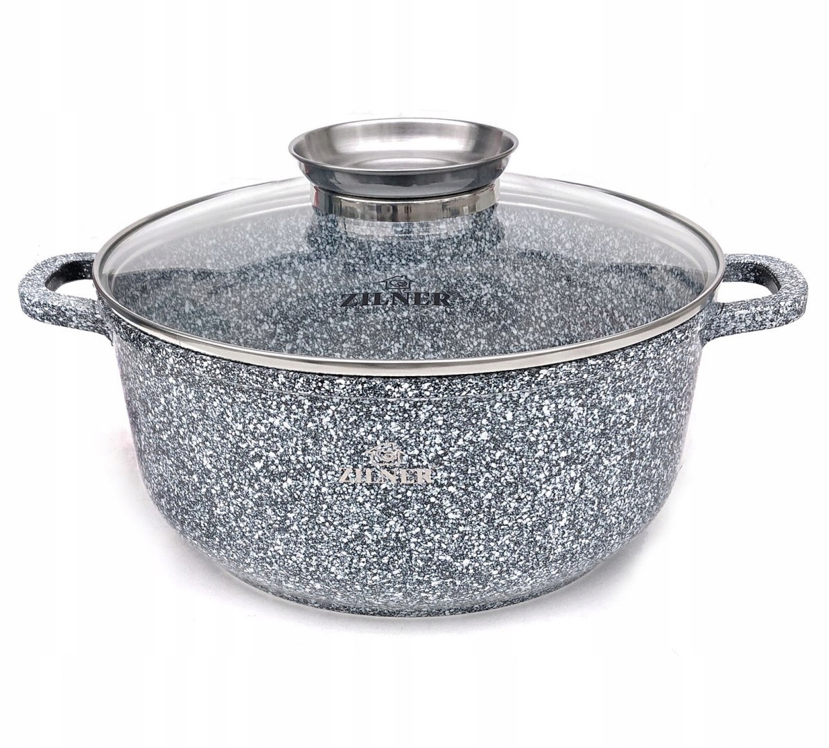 7-элементные кастрюли из литого алюминиевого сплава с антипригарным покрытием с примесью гранитной крошки (имитирующей мрамор), изготовленные по нанотехнологиям процесс, создавая на поверхности чрезвычайно плотный, компактный и гладкий слой.