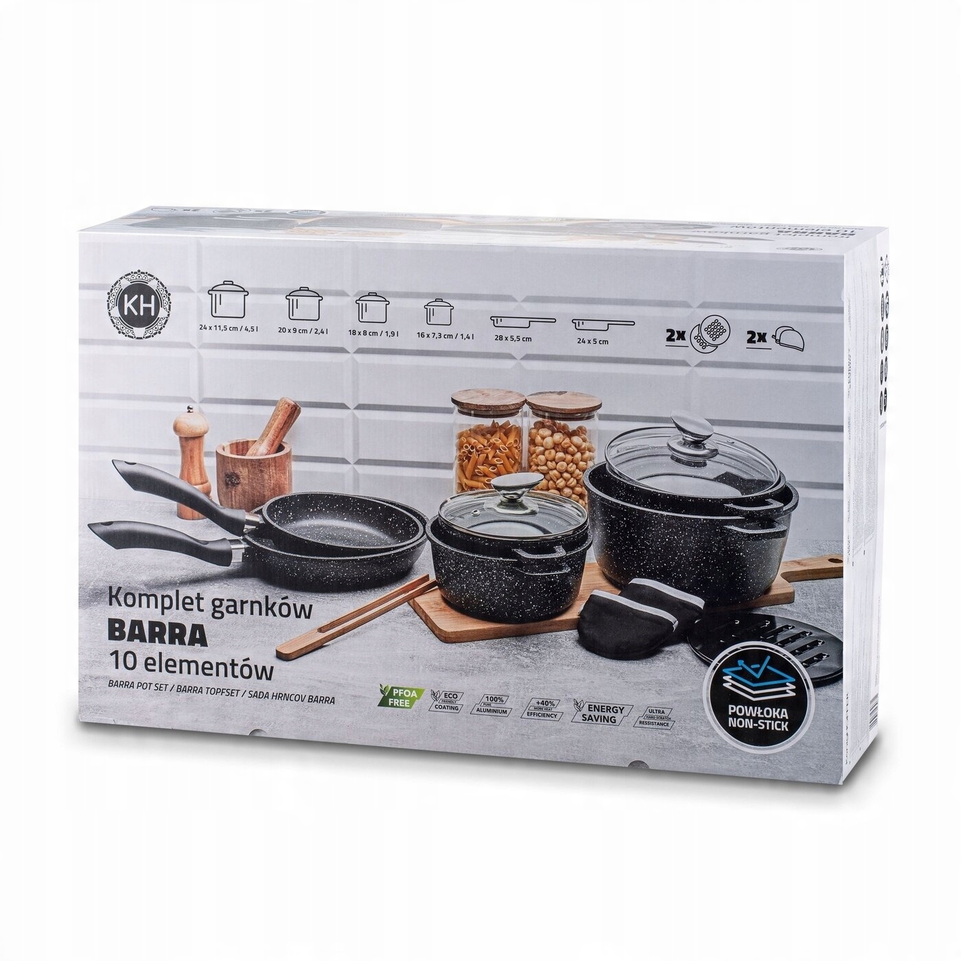 Набор мраморных кастрюль Konighoffer Barra из 10 предметов имеет 2 крышки из материала. Набор позволяет безопасно готовить и жарить, снижая риск обжечь руки. В комплект входят сосуды емкостью от 1,2 до 4,4 литров. Кастрюли поставляются со стеклянными крышками со стальным ободом для защиты от сколов. У них также есть стильные ручки из нержавеющей стали. С набором каменных кастрюль Barra вы сможете готовить на плитах любого типа. Мраморное антипригарное покрытие и отделка алюминиевого корпуса под черный мрамор добавляют элегантности. Они быстро нагреваются, поэтому вы сэкономите время и силы. Они идеально подходят для семейной кухни или в качестве подарка. Они также хорошо защищены от высоких температур и равномерно проводят тепло. Ручки сковороды изготовлены из медленнонагревающегося бакелита. Они обеспечивают надежный захват при переноске. У вас также есть возможность использовать сами кастрюли без крышек в духовке (максимум 220 градусов по Цельсию). Их безопасное использование и нетоксичность для окружающей среды подтверждены маркировкой PFOA Free. Чтобы не повредить стол или кухонную столешницу, достаточно использовать 2 подушечки для горячей посуды, входящие в комплект.