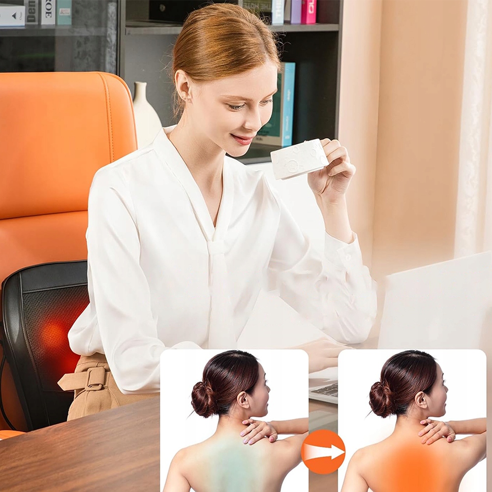 - Встроенный нагревательный модуль при включении выделяет мягкое тепло. Тепло проникает в мышцы шеи, плеч и поясницы, помогая снять мышечное напряжение. В сочетании с разминающим массажным эффектом он дополнительно поддерживает местное кровообращение и облегчает боль. Устройство особенно рекомендуется для использования осенью и зимой или в помещениях с кондиционером, чтобы избежать дискомфорта, вызванного холодом во время массажа, обеспечивая более теплое и глубокое расслабление.