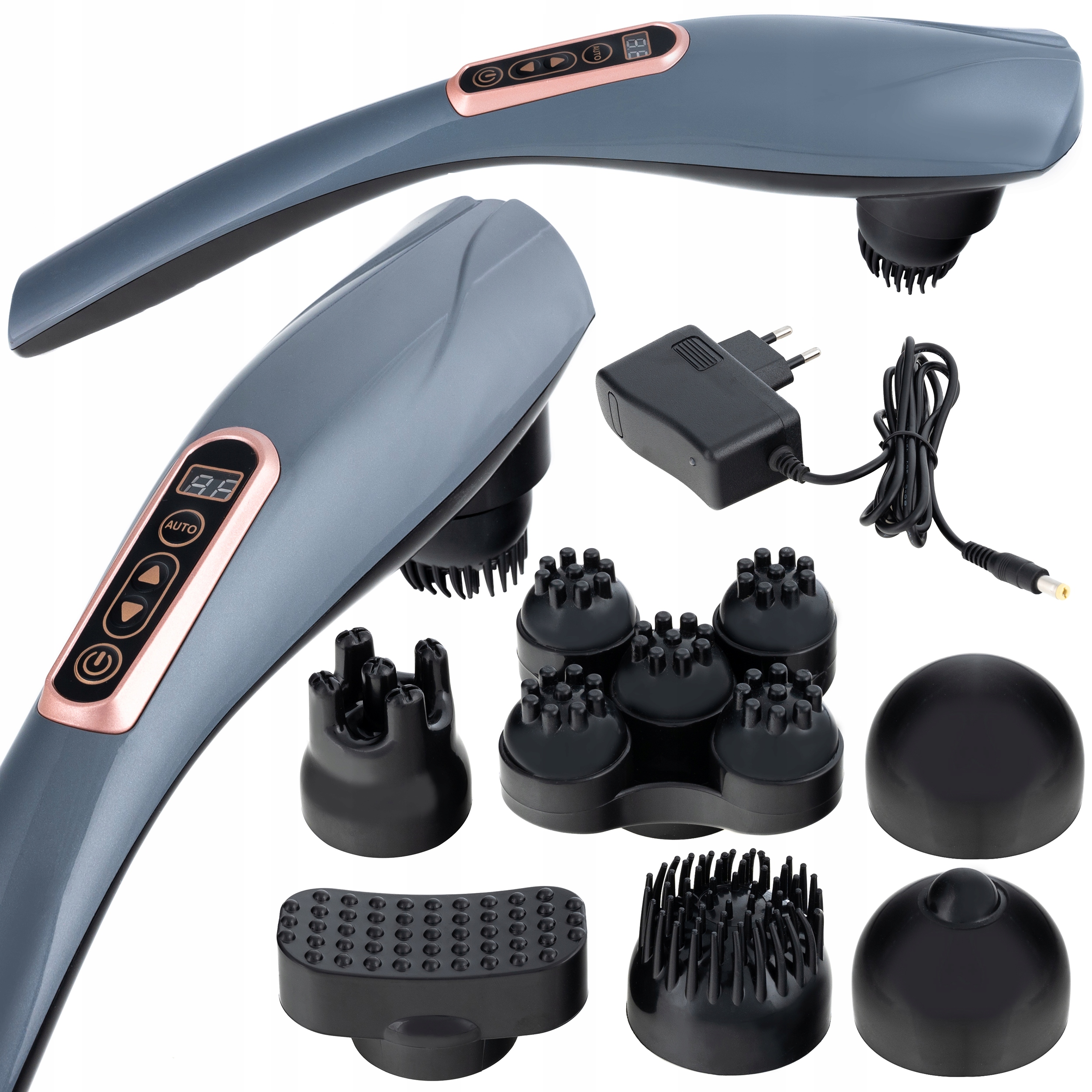 Массажер оснащен 6 массажными головками и сетевым зарядным устройством.