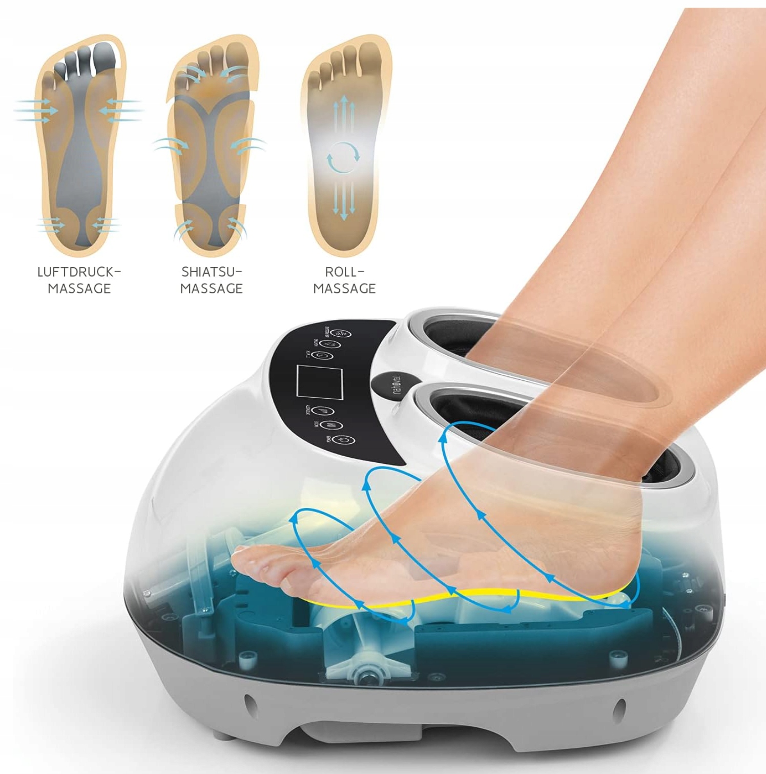 - МАССАЖ ВВС: Сжатие воздуха обеспечивает комплексный массаж ног. Он окружает ногу как снизу, так и сверху, благодаря которой она уравновешивает и расслабляется. Удобно и без изгиба и кривизны с прикрепленным пультом дистанционного управления. Альтернативно, это также можно сделать с помощью интуитивного сенсорного дисплея
