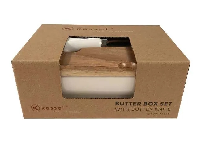 Эстетичная фарфоровая масленка с крышкой из акации и ножом для масла. Натуральная твердая древесина придает каждой крышке идеальный дизайн. Нож изготовлен из нержавеющей стали, имеет фарфоровую ручку.