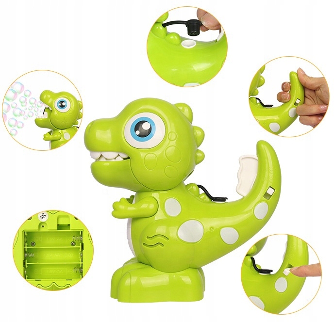Игрушка выглядит очень красиво и при включении раскрывает множество сюрпризов. Чтобы начать делать пузыри, поместите батарейки на дно динозавра. У очаровательной рептилии на хвосте имеется наполнитель для пузырьковой жидкости, после наполнения его нужно заткнуть. В комплект входит жидкость и специальная насадка для слива жидкости. На хвосте есть кнопка, при нажатии на которую игрушка издаст звук, откроет рот и включит меняющую цвет лампочку.