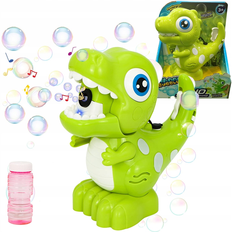 Наслаждение для маленьких любителей мыльных пузырей — зеленый динозавр для надувания пузырей.