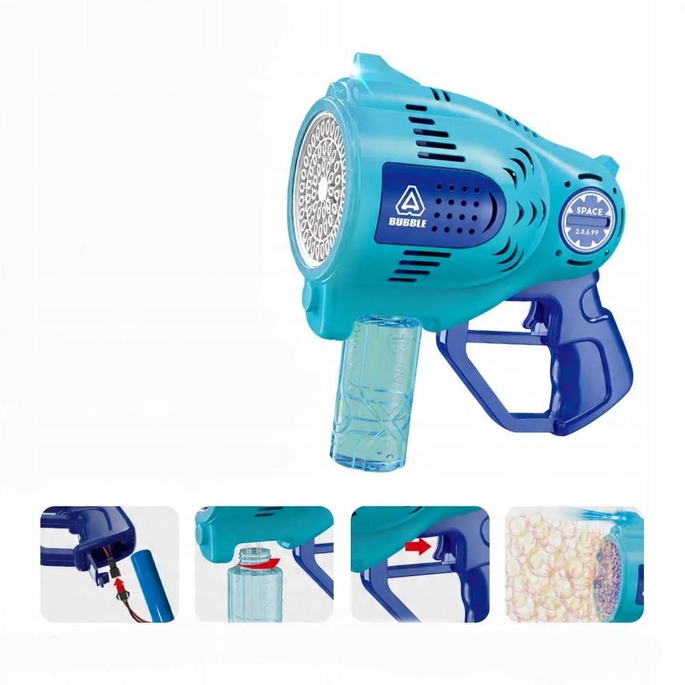 Удивительный пузырьковый пистолет, который выпускает множество мерцающих пузырьков при нажатии на спусковой крючок.