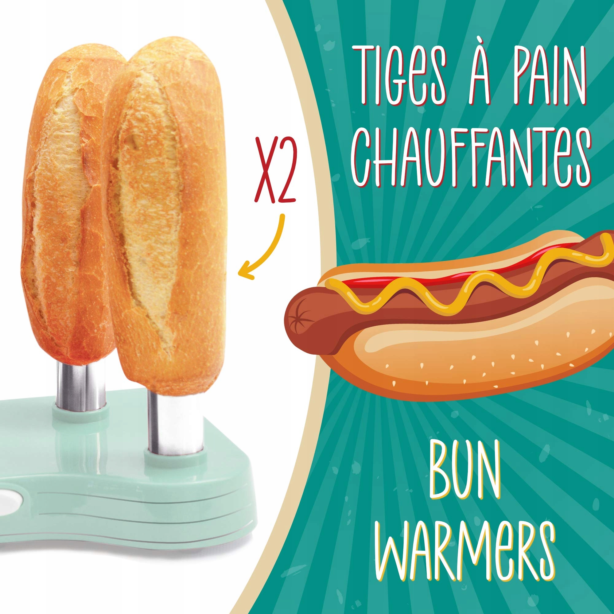 Настоящая машина для хот-догов — устройство, вмещающее 12 сосисок и 2 хлеба. Оснащен нагревательными стержнями из нержавеющей стали, переключателем включения и выключения с подсветкой из пластика, предназначенного для контакта с пищевыми продуктами. Простое управление и легкость очистки.