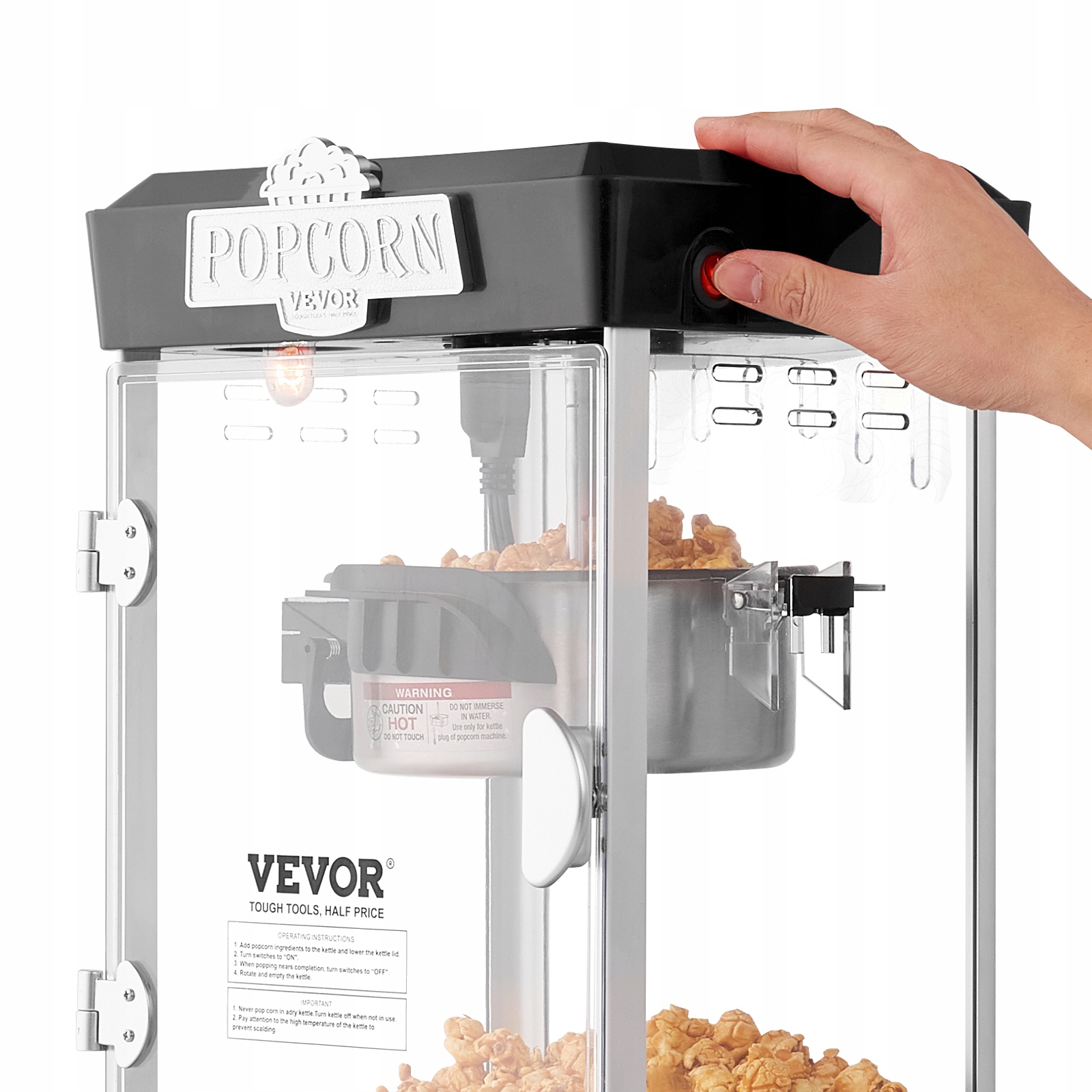 Простота в эксплуатации, длительный нагрев: независимая конструкция с двумя переключателями упрощает работу, делая эту настольную машину для попкорна простой в использовании любым персоналом. Готовый попкорн падает на подогреваемый поднос, чтобы оставаться свежим, а свет заставляет его сверкать и привлекать всеобщее внимание!