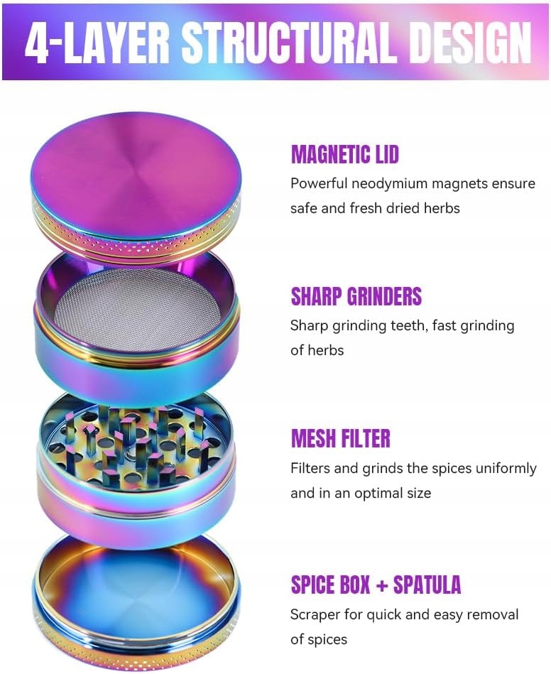Мельница, состоящая из четырех частей, позволяет быстро измельчать травы, специи и пыльцу, гарантируя равномерный результат за несколько мгновений. Это практичный инструмент для повседневного использования на кухне, идеально подходящий для людей, которые ценят свежие ароматы.