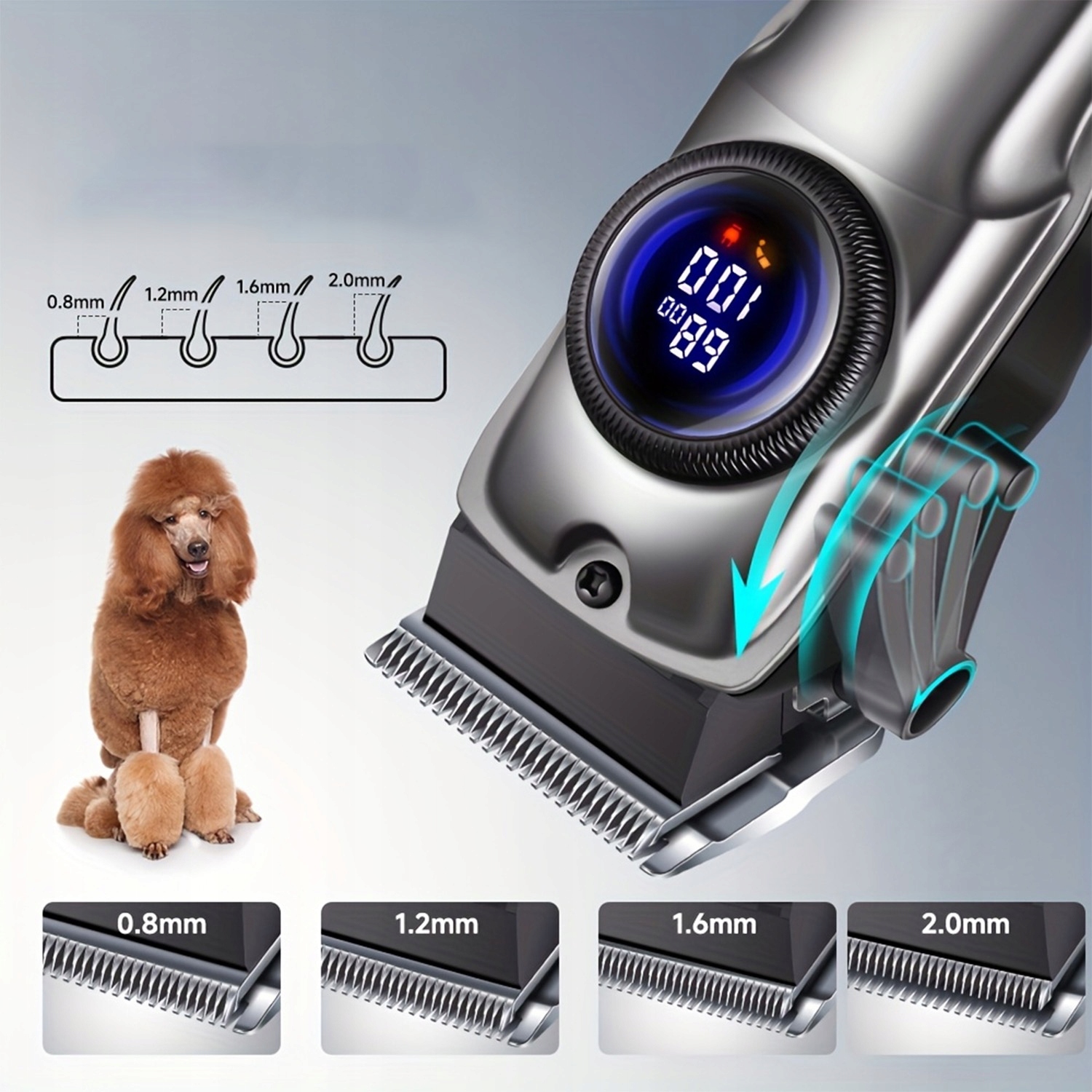 Головка лезвия поддерживает четыре прецизионных настройки от 0,8 до 2 мм, а регулируемый гребень, доступный в четырех длинах от 3 до 12 мм, позволяет точно контролировать длину волос независимо от того, бреете ли вы все тело или создаете деликатную, детальную укладку. С этой функцией легко справятся даже новички, исключив ошибки и обеспечив более красивую укладку вашему питомцу.