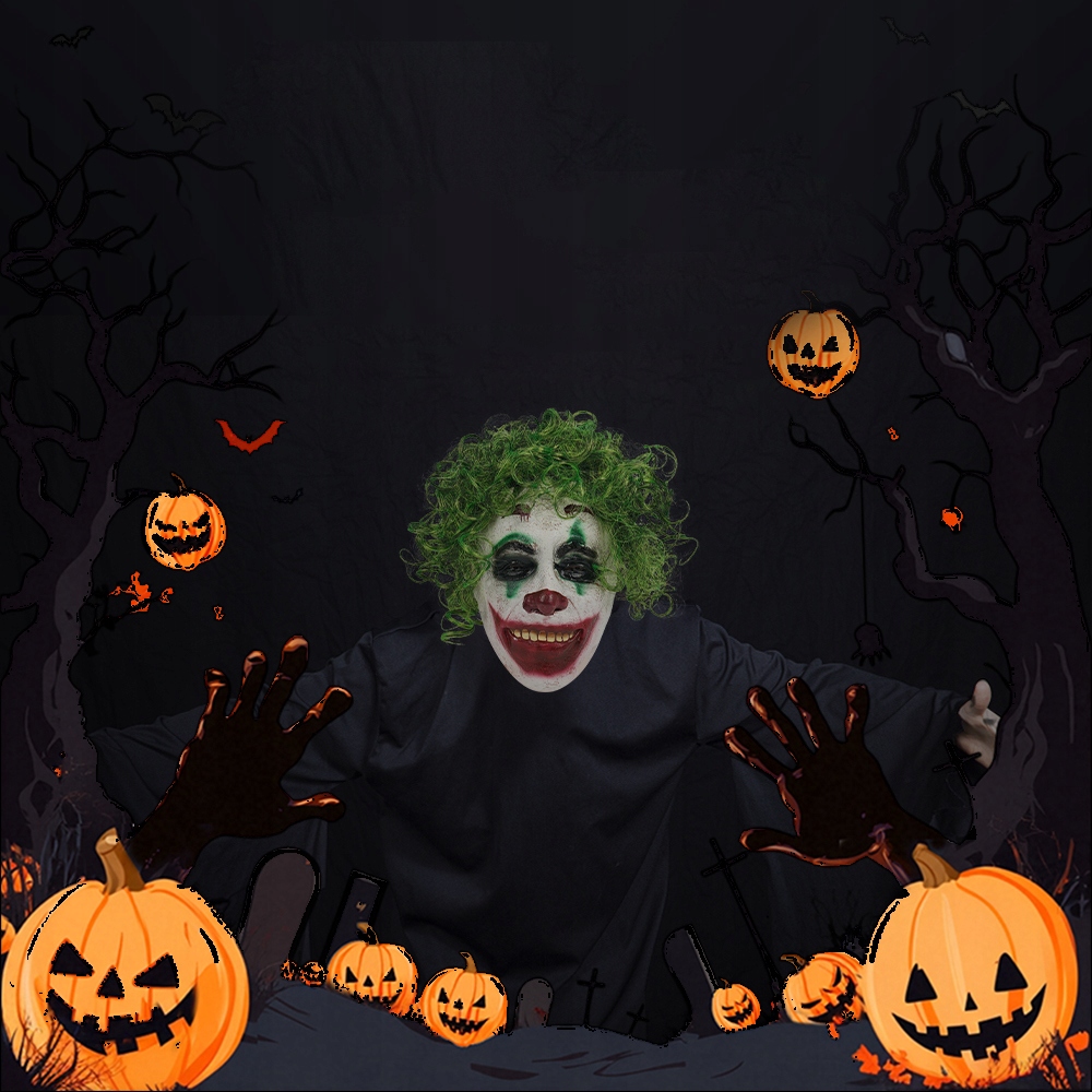 🤡🤡【Хорошо сделано】Эта маска клоуна поставляется в комплекте с зеленым париком, треснувшими глазами, страшным большим ртом и зубами. Реалистичный внешний вид клоуна веселый и игривый, но в то же время пугающий, поэтому он незаменим на вечеринках в честь Хэллоуина.