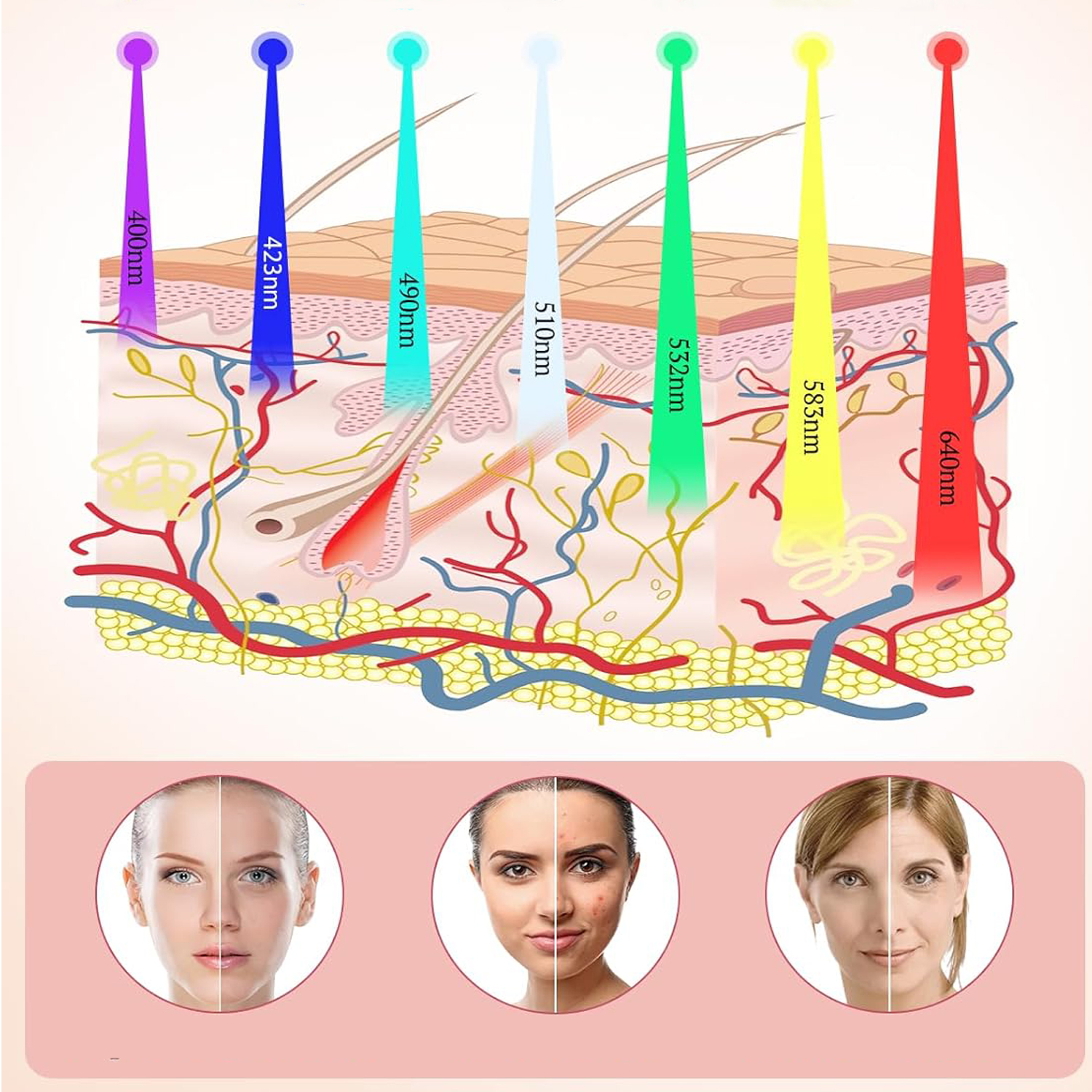 - Волны разной длины могут проникать глубоко в ткани кожи и лечить прыщи, бледную кожу, тонкие линии и другие проблемы с кожей.