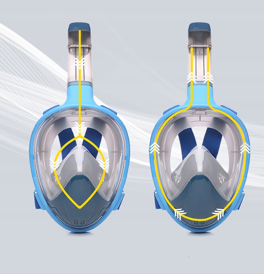Маска дополнена полностью герметичной складной прямой трубкой высочайшего качества, имеющей два перекрывающих клапана и два канала для вдоха и выдоха. Данное решение. гарантирует, что вода не попадет в маску во время ныряния. Клапаны автоматически поднимаются, когда вся маска погружается под поверхность воды, блокируя доступ внутрь полной маски. Важно отметить, что теплый воздух, которым мы дышим во время плавания, выходит наружу, поэтому окна полнолицевой маски не запотевают.