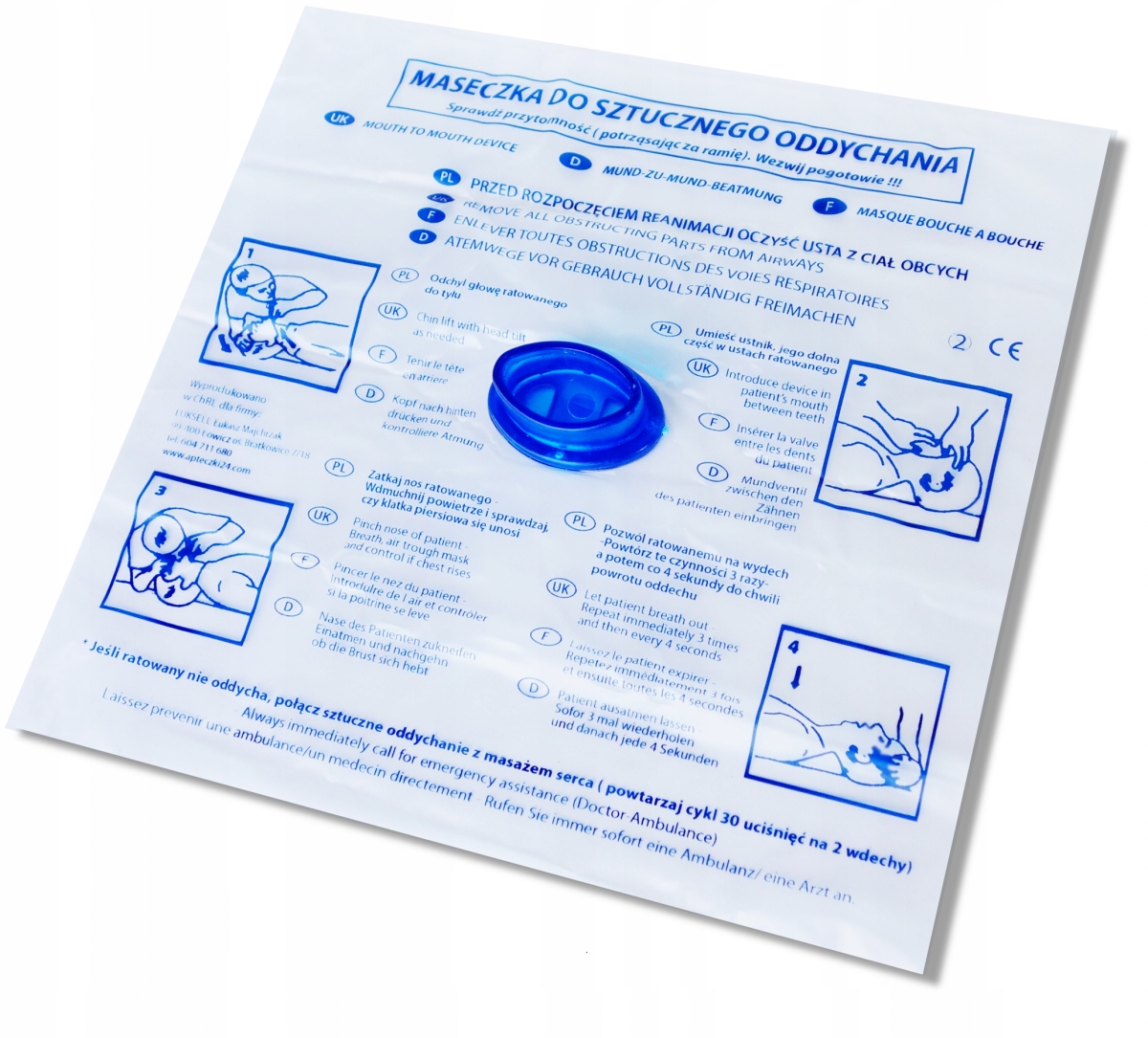 - Маска имеет графические инструкции по оказанию первой помощи и описание на четырех языках PL, UK, F, D