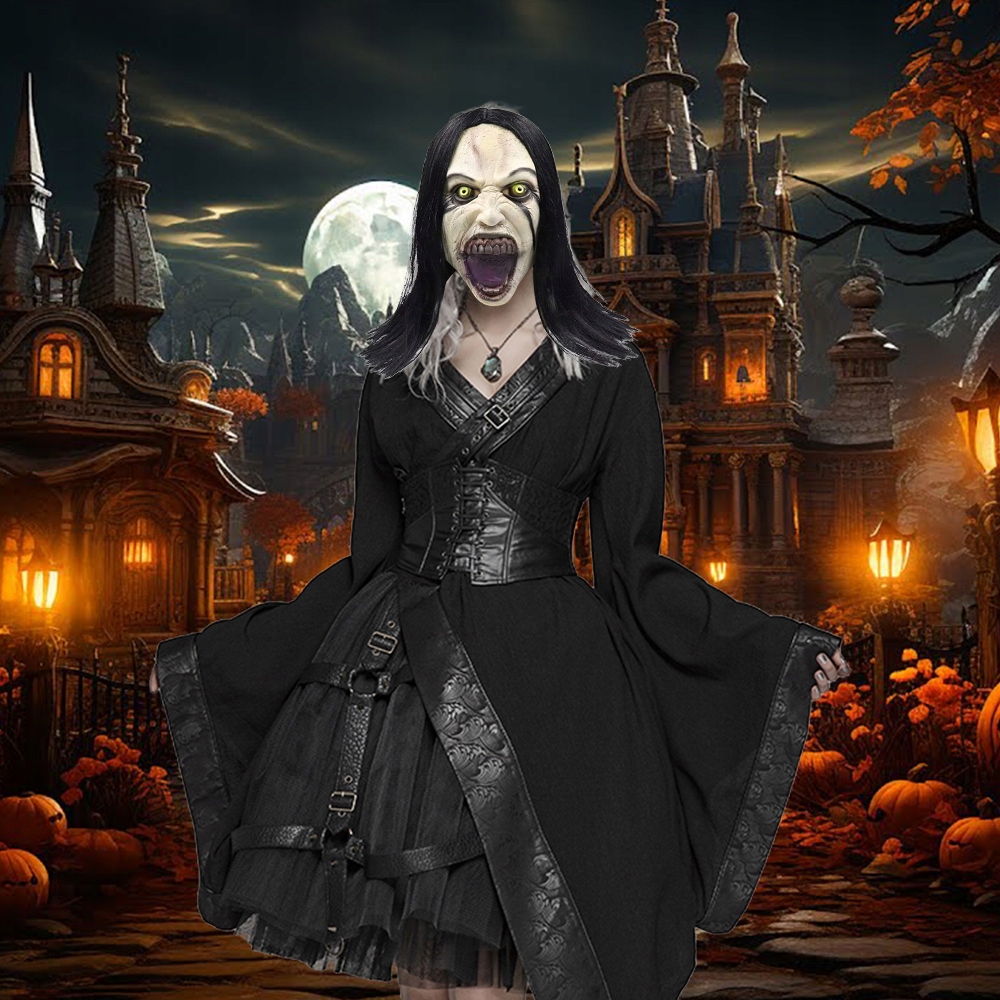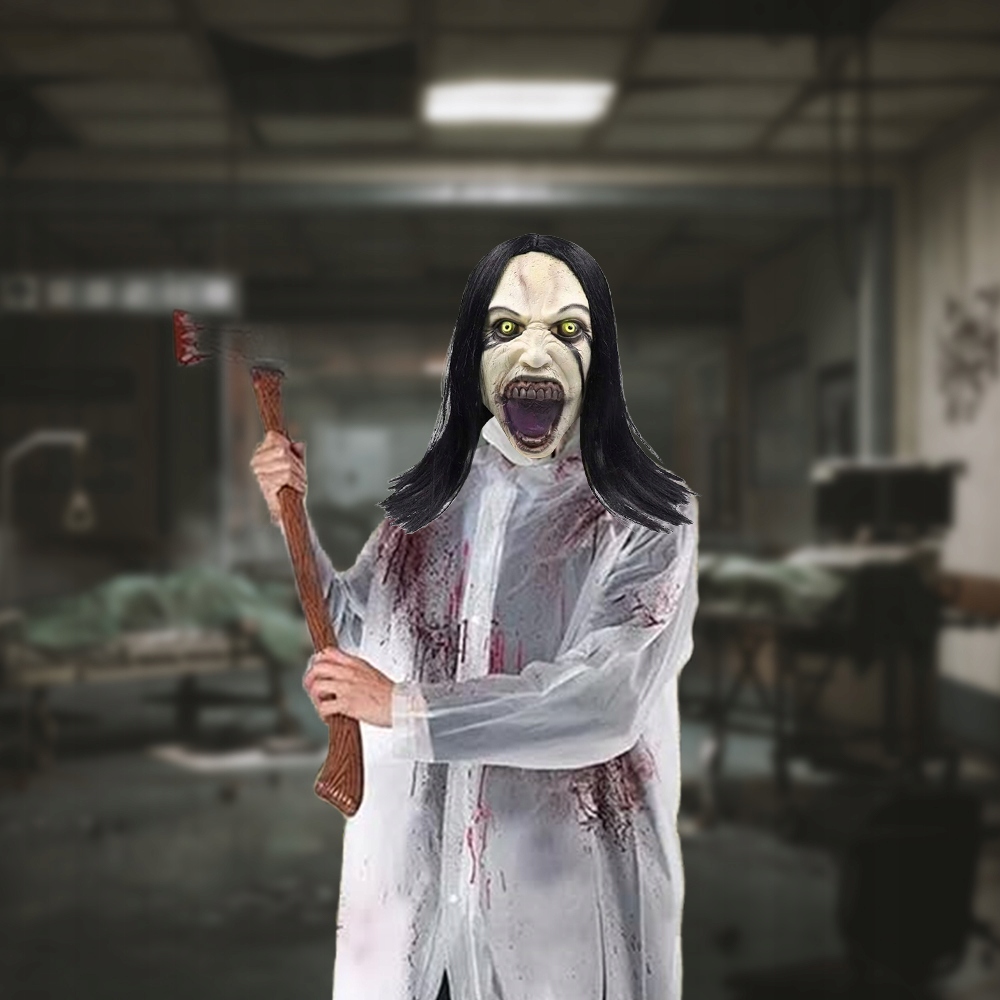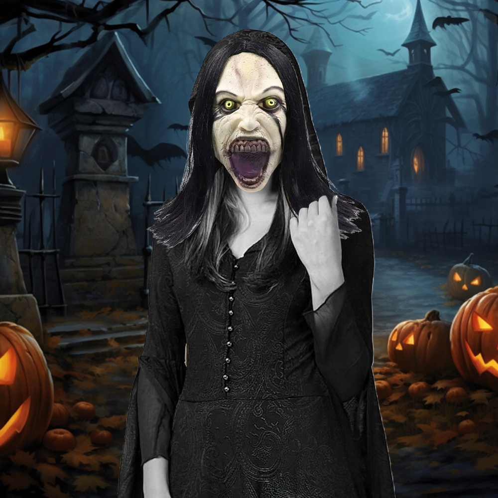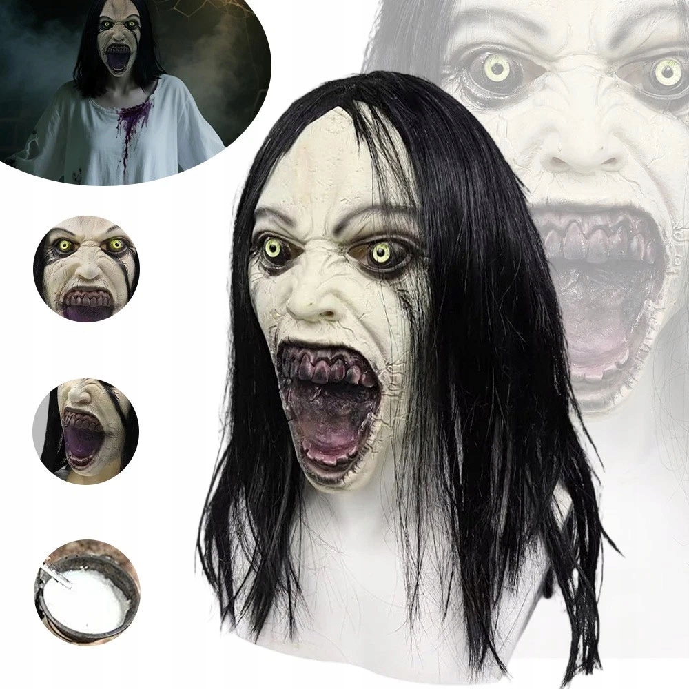 ПОЛНАЯ АУТЕНТИФИКАЦИЯ: латексная маска, закрывающая всю голову, изображающая демоническое женское привидение с искаженным лицом, открытым ртом и распущенными волосами. Эффект чрезвычайно реалистичный и устрашающий со всех сторон!