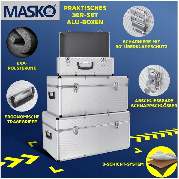 Маска предлагает вам набор из 3 алюминиевых ящиков для отдельного хранения, например, Инструменты, коллекции, компакт -диски, файлы и т. д. Коробки, выглядящие высоким качеством, имеют хорошего качества и очень разнообразны благодаря трем размерам.