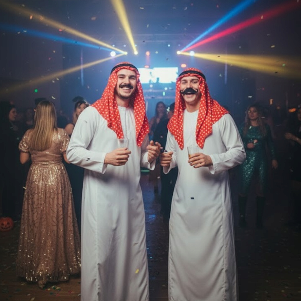 Маскировка сразу привлекает внимание благодаря классическому белому халату и характерному тюрбану. Стиль, вдохновленный традиционной арабской одеждой, придает аутентичности и выразительности. Идеально подходит для тематических вечеринок, карнавалов или костюмированных вечеринок.