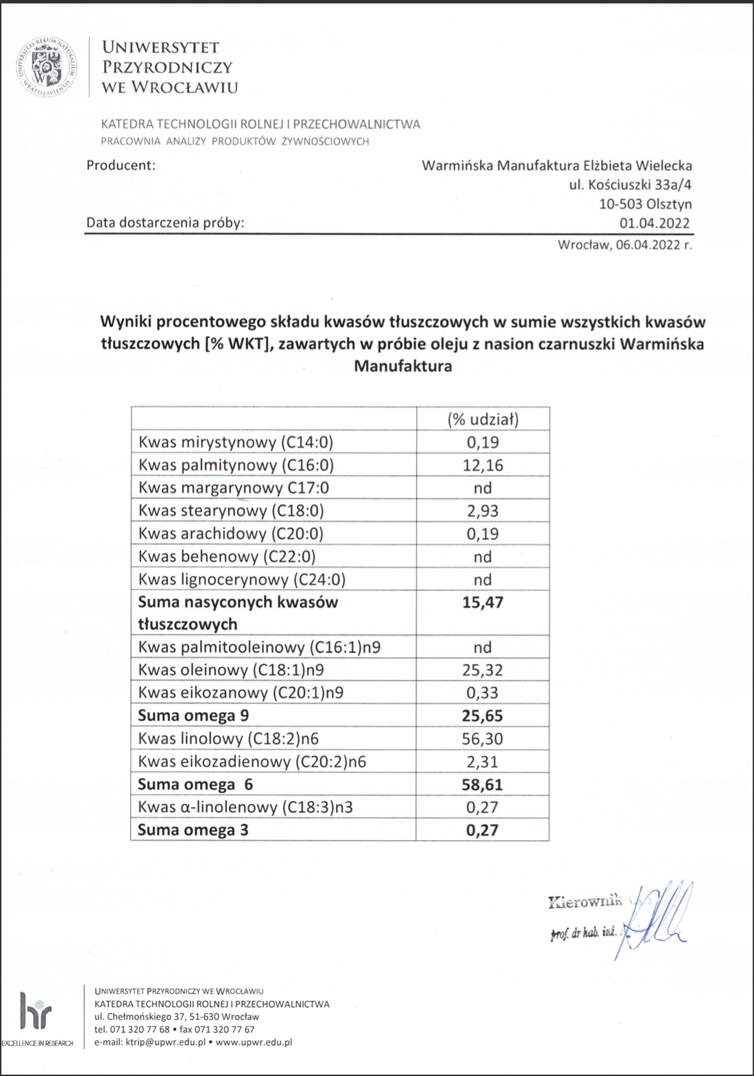 Исследования, проведенные в лаборатории Вроцлавского университета наук об окружающей среде и жизни, позволили нам документально подтвердить высочайшее качество нашего масла черного тмина.