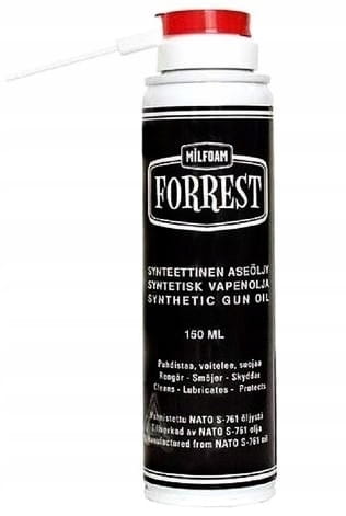 Milfoam Forrest Synthetic Gun Oil — инновационное, полностью синтетическое масло, производимое в Финляндии, специально предназначенное для смазки и обслуживания огнестрельного оружия.