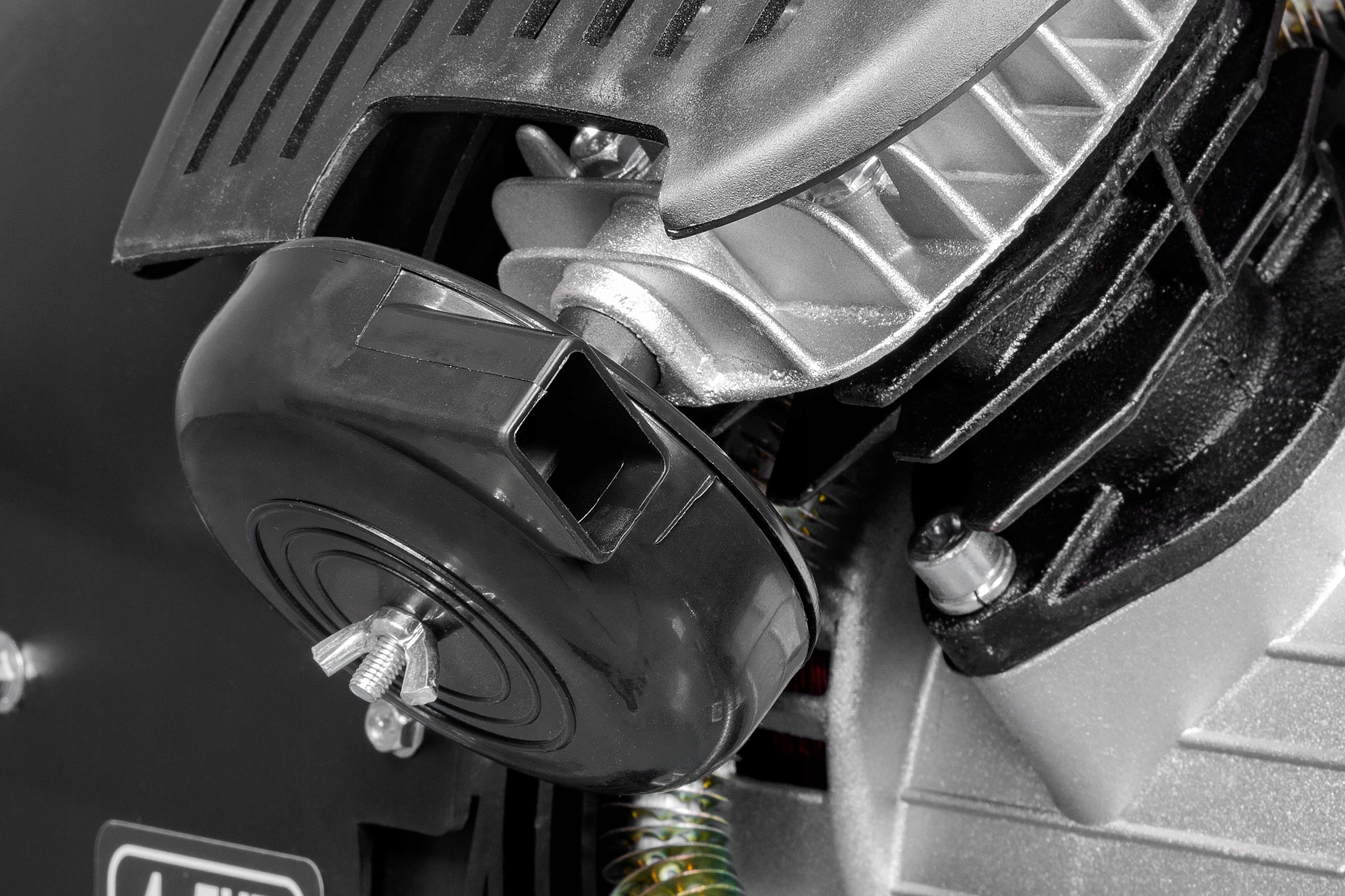 Двигатель устройства имеет максимальную мощность 3,3 кВт и скорость 2850 об/мин. Благодаря соответствующему передаточному числу компрессор работает на низких оборотах 1200 об/мин, что увеличивает срок его службы и снижает нагрев системы. Двигатель оснащен тепловой защитой для защиты от перегрузки.