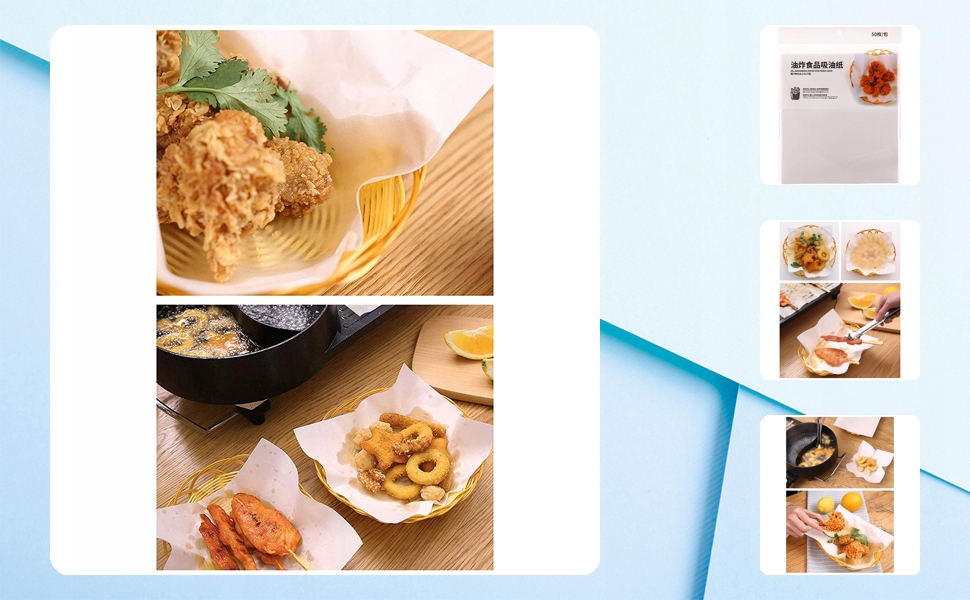 Маслопоглощающая бумага: подходит для жирных жареных продуктов, таких как жареная курица, картофель фри и куриный картофель.