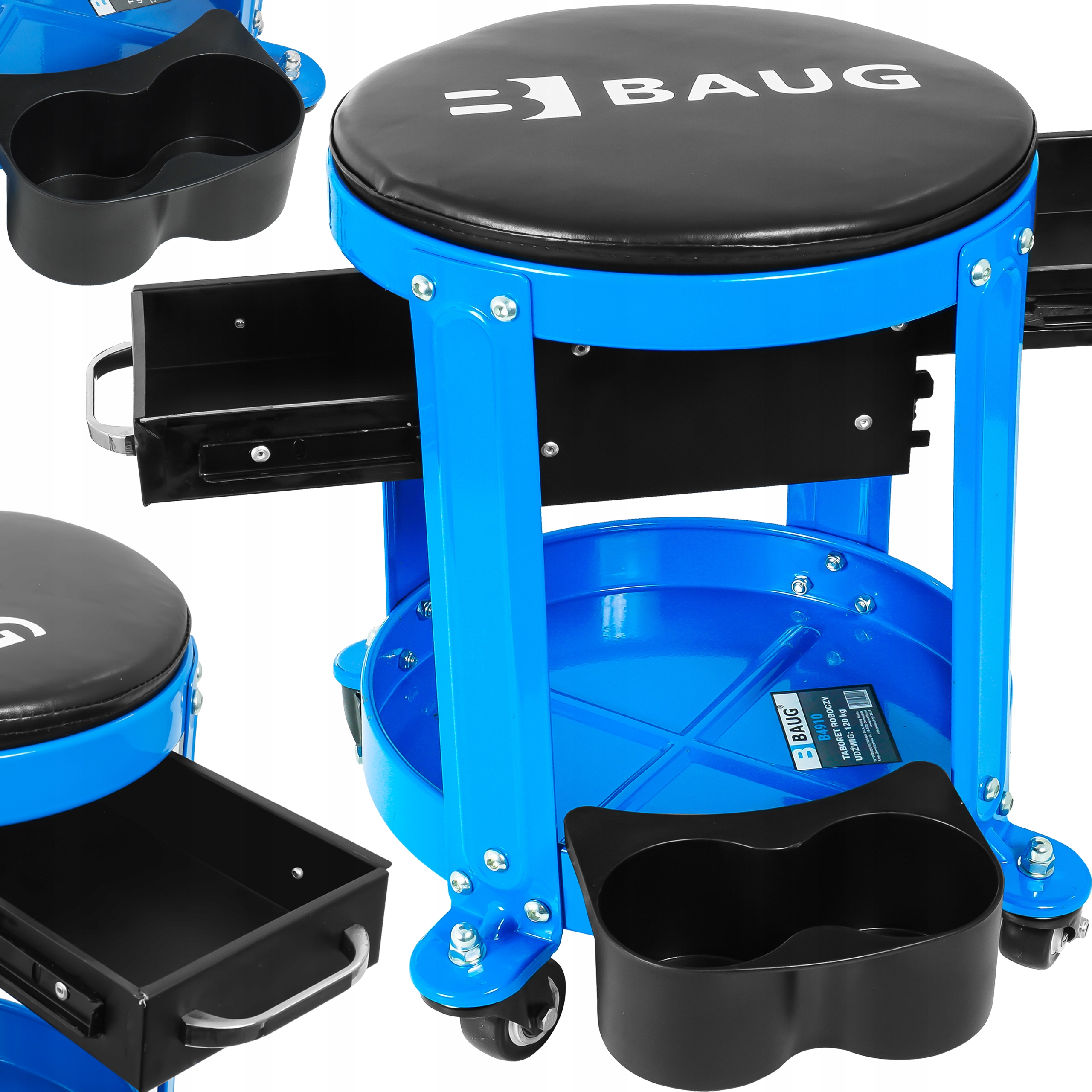 Табурет для мастерской предназначен для использования в профессиональных мастерских, автосервисах, ремонтных мастерских, а также отлично подойдет в домашнем гараже. Оснащен четырьмя поворотными колесами, которые повышают его мобильность. Практичное решение – оборудовать его двумя ящиками, куда механик сможет разместить инструменты, используемые во время работы. Покрытие удобного сиденья выполнено из ПВХ. Есть подставка для напитков.