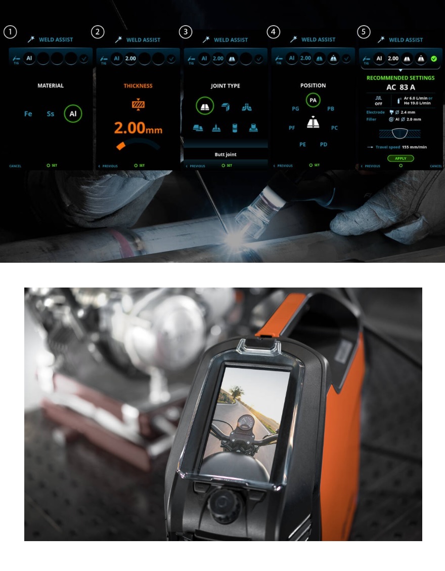 Просто следуйте простым инструкциям на экране — выберите тип свариваемого материала, его толщину, тип соединения и положения сварки — и функция сварочного помощника подберет и установит оптимальные параметры для простой и эффективной сварки. Также отображаются рекомендации по размеру электрода, сварочной проволоке, расходу газа, типу канавки, форме сварного шва и скорости сварки. Идеально подходит для создания pWPS.