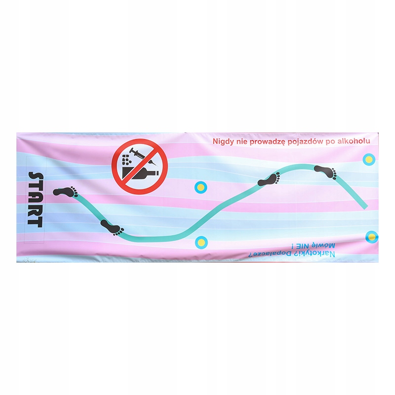 Выкатной коврик с обозначенной линией — дорожкой, по которой необходимо следовать в очках, содержащих алкоголь или наркотики, — идя вдоль этой линии. Коврик изготовлен из качественного ПВХ, плотностью 510 г/м2. Площадь баннера 6м2 1,5х4 м.