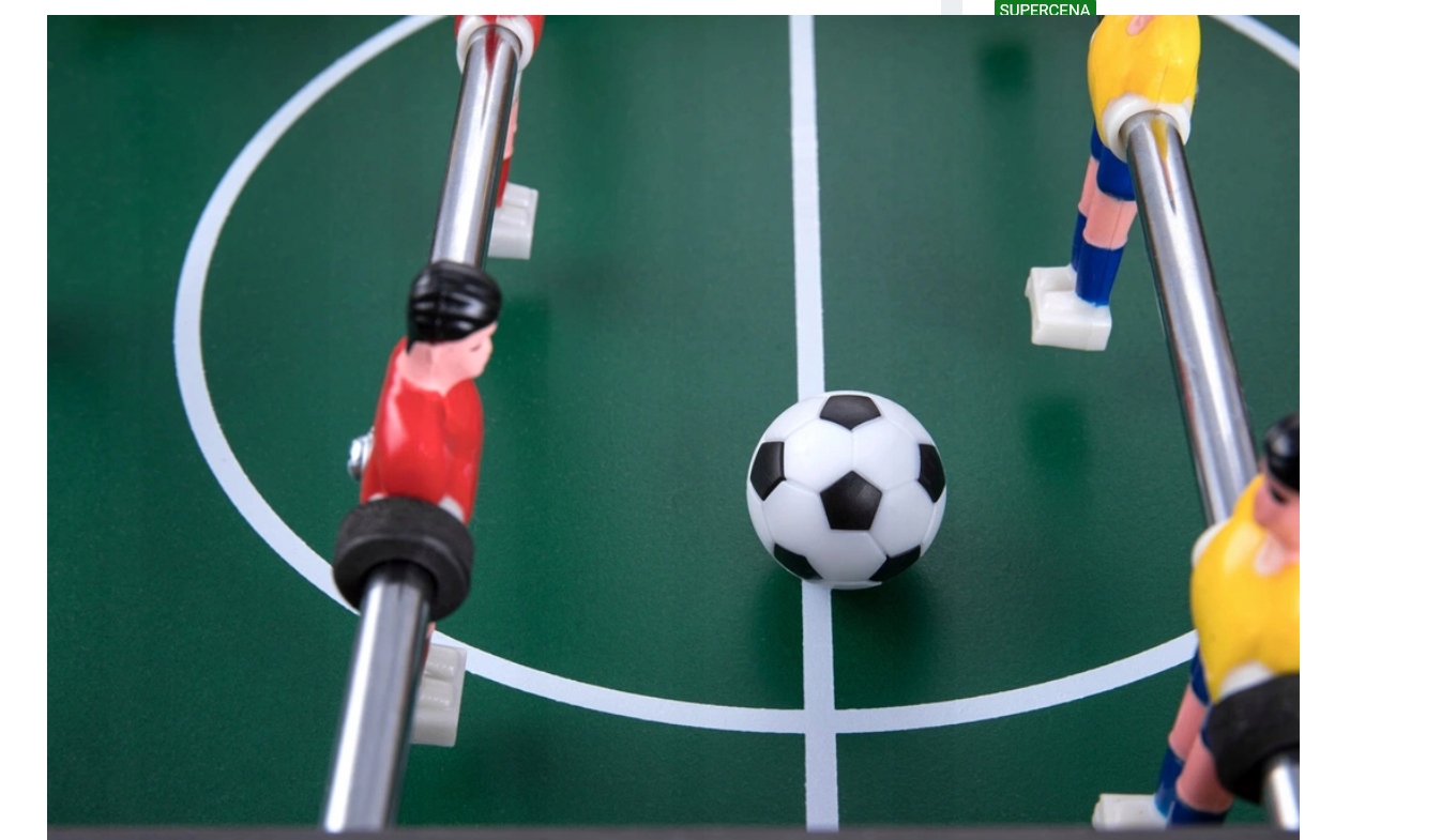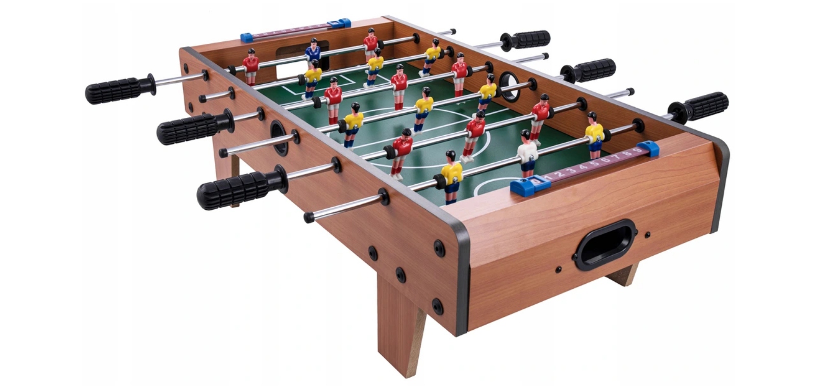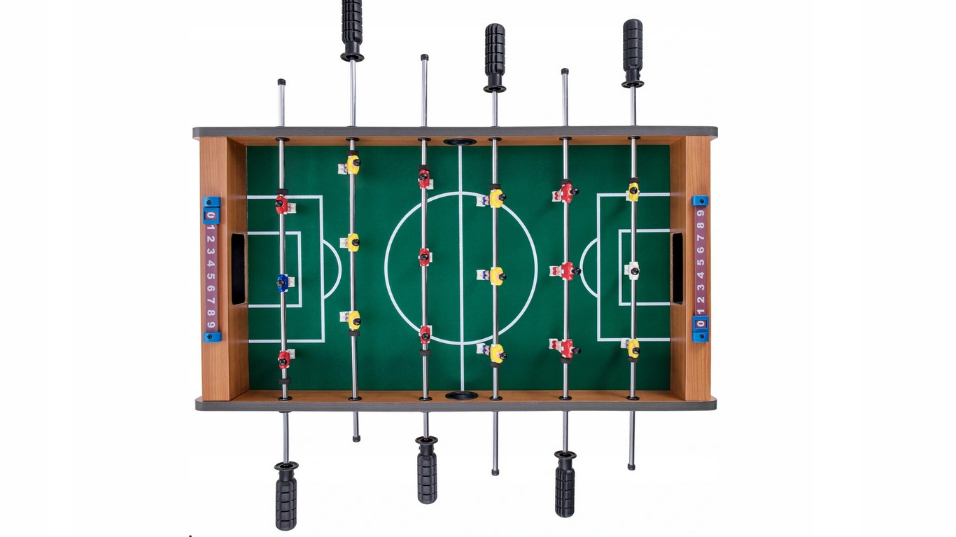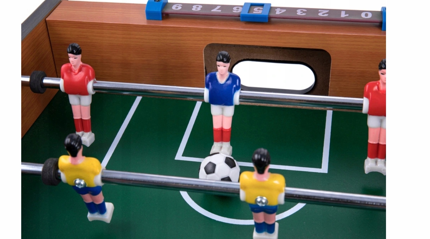 9 игроков в команде (Аранжирование 3 , 3, 3). Турнир будет, но вы можете легко запустить игру один на один. Правила матча очевидны - все выбирают свои цвета, устанавливаются на правильную сторону и ... цель! Удобный, не солипный пистолет хорош в руках, благодаря тому, что бары легко ориентироваться в команде футболистов. Деревянные, высокие стенды защищают поле, благодаря тому, что мяч не упадет за границу. Сразу за вратарями есть дыры для мячей, где забили голы. В дизайне игрового шага есть две цели, которые поставлены вручную - на каждой странице есть шкала с числами от 0 до 9, которые облегчат контроль результатов во время столкновения