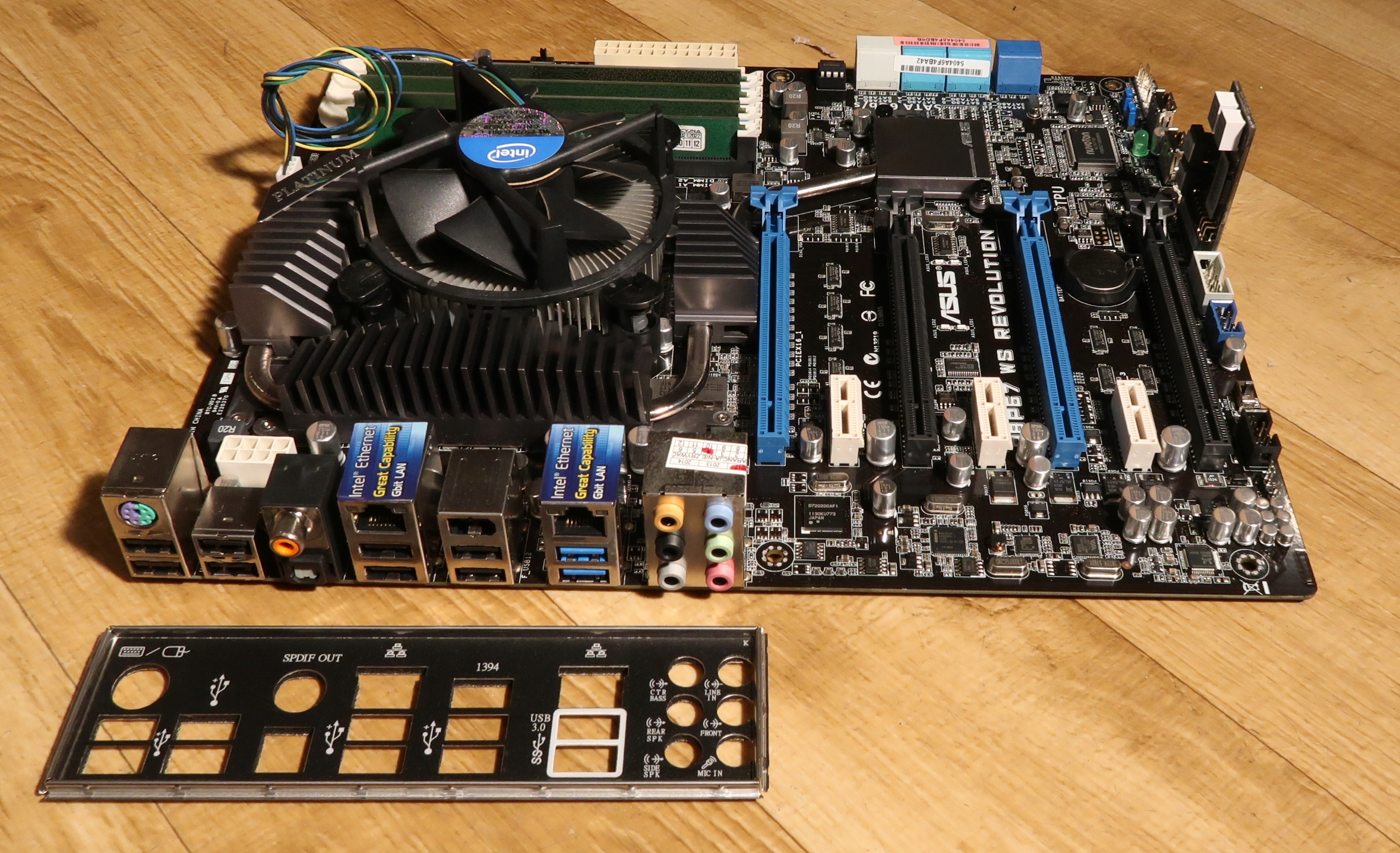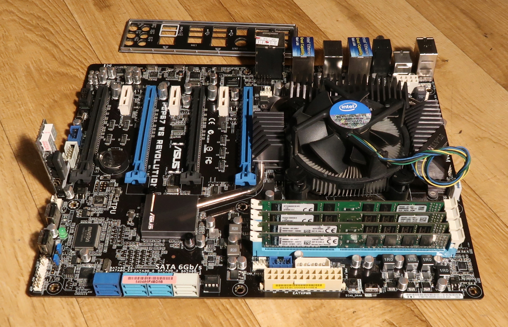 Полностью рабочая материнская плата ASUS 9P67 WS REVOLUTION 4x PCI-E. В комплект входит материнская плата, процессор, система охлаждения, плата TPM, решетка.