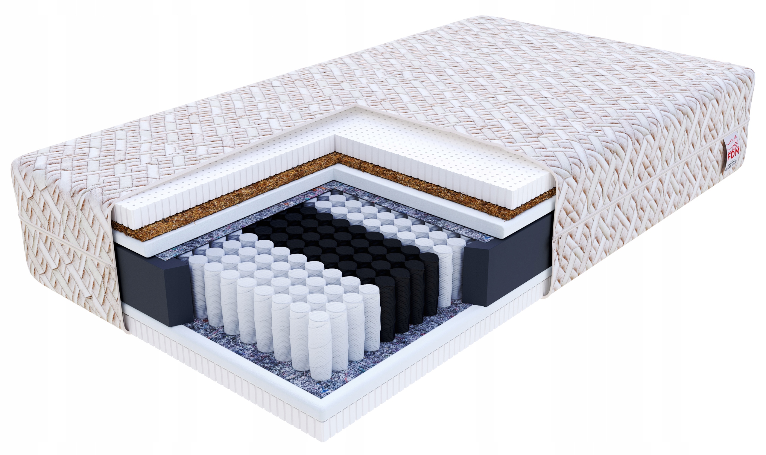 Натуральный кокос Волокна они легкие и воздушные, а также очень прочные и гибкие, устойчивые к влаге и деформации. Кокос обладает противоаллергическими свойствами и предотвращает рост грибков и клещей. Особенно рекомендуется для клиентов, предпочитающих более жесткие матрасы.