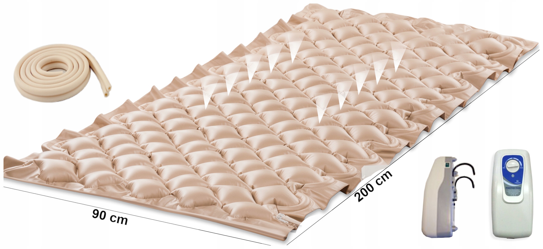 Размеры матраса: 200х90х6 0,5 см (поверхность пузыря). Дополнительно в верхней и нижней части матраса имеется примерно 40 см поверхности, которую можно закатать под обычный матрас, что делает противопролежневый матрас более устойчивым на кровати.