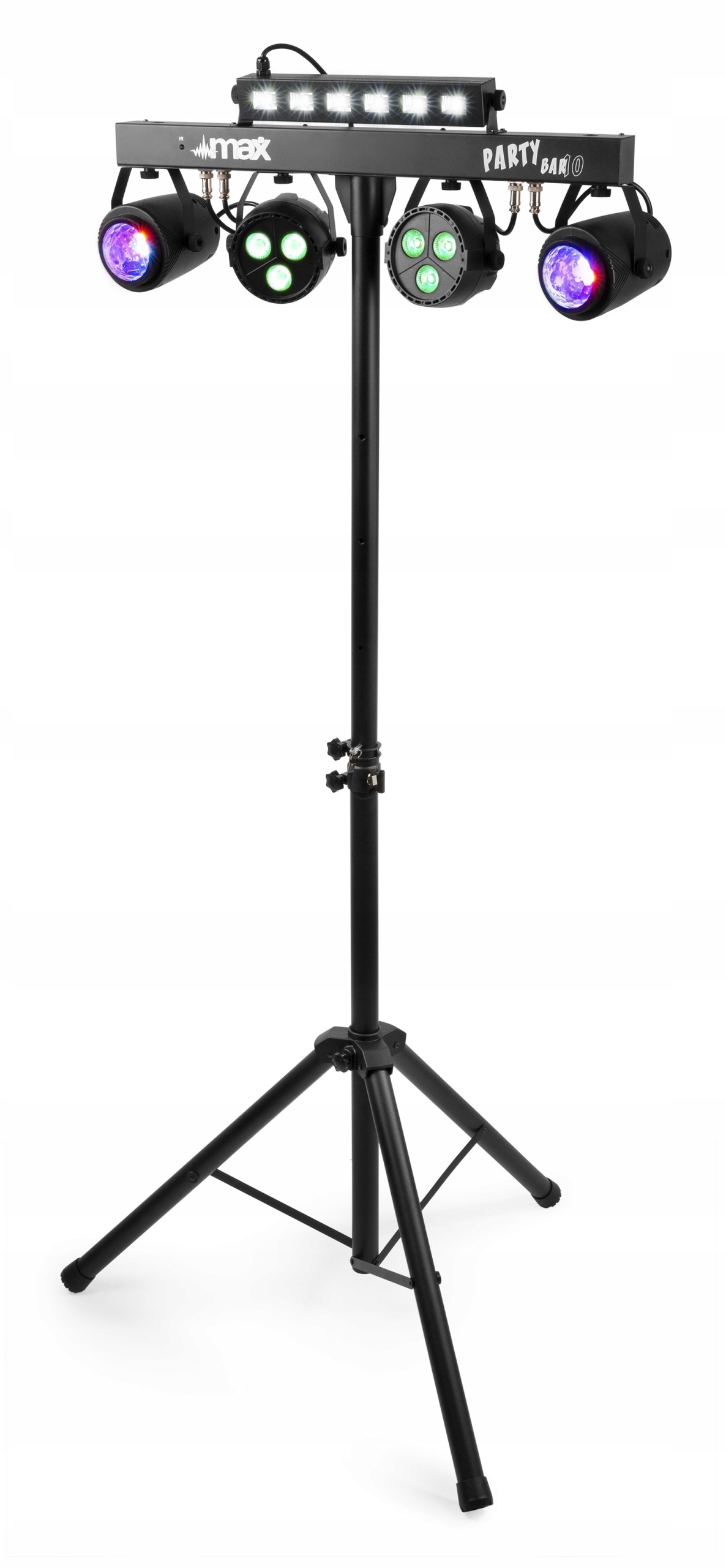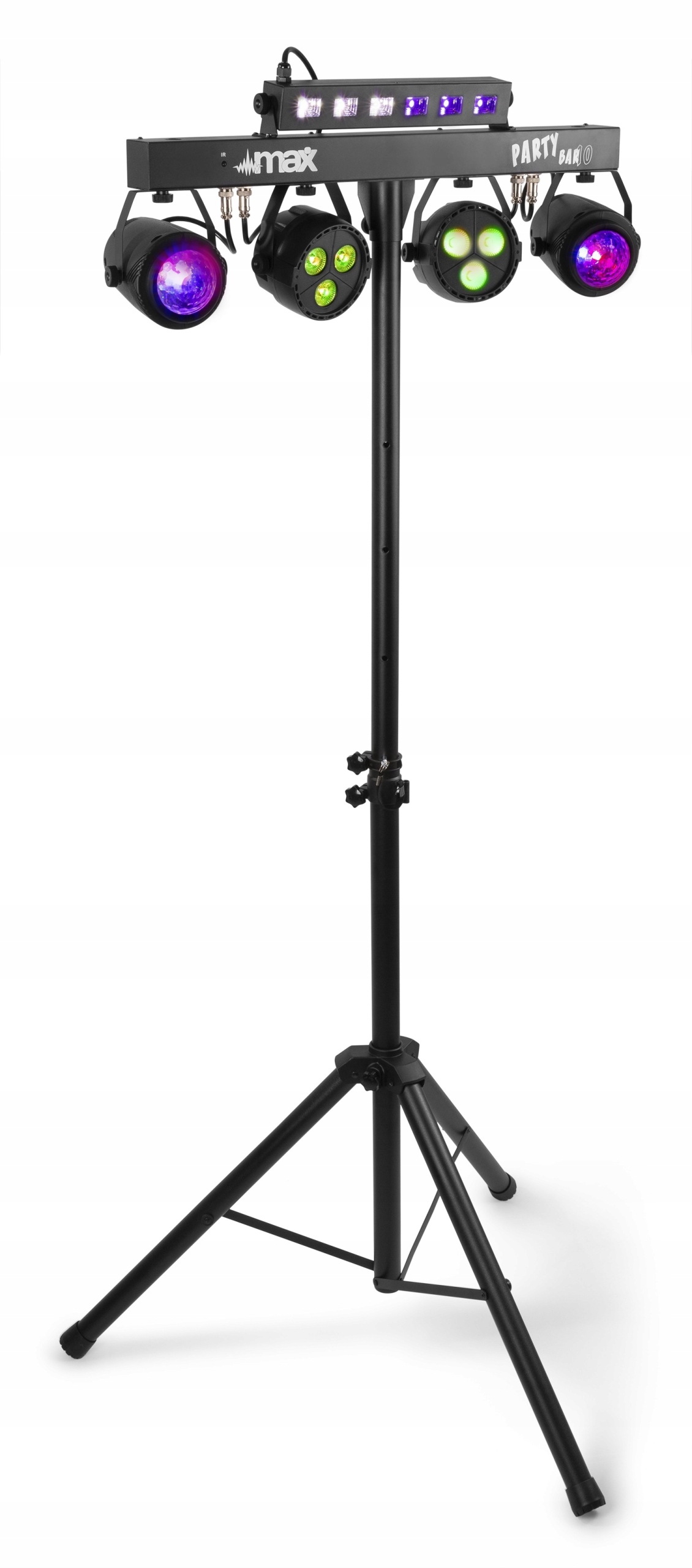 Серия MAX PartyBar состоит из ряда комплектов, оснащенных светодиодными световыми эффектами. Все комплекты оснащены светодиодами высокой интенсивности различных цветов. PARTYBAR12 SET — это эффект Plug and Play, которым можно управлять с помощью DMX, инфракрасного пульта дистанционного управления или автоматических и звуковых программ, выбираемых с помощью панели управления со светодиодным дисплеем и кнопками. В комплект входит подставка-штатив, позволяющая быстро и легко установить. Он был разработан для мобильных диджеев, специальных мероприятий, клубов и т. д.