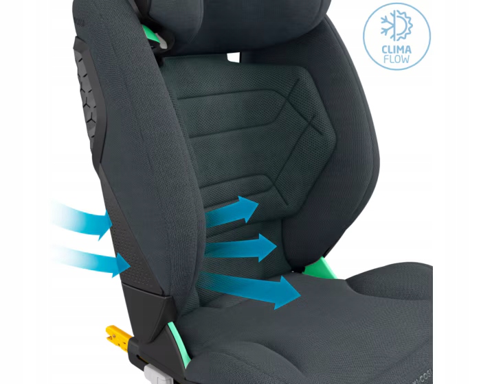 в автомобильном сиденье использует улучшенные и большие вентиляционные панели климафта, а также дышащие ткани и пену для улучшения циркуляции воздуха и обеспечения ребенка правильной температурой.