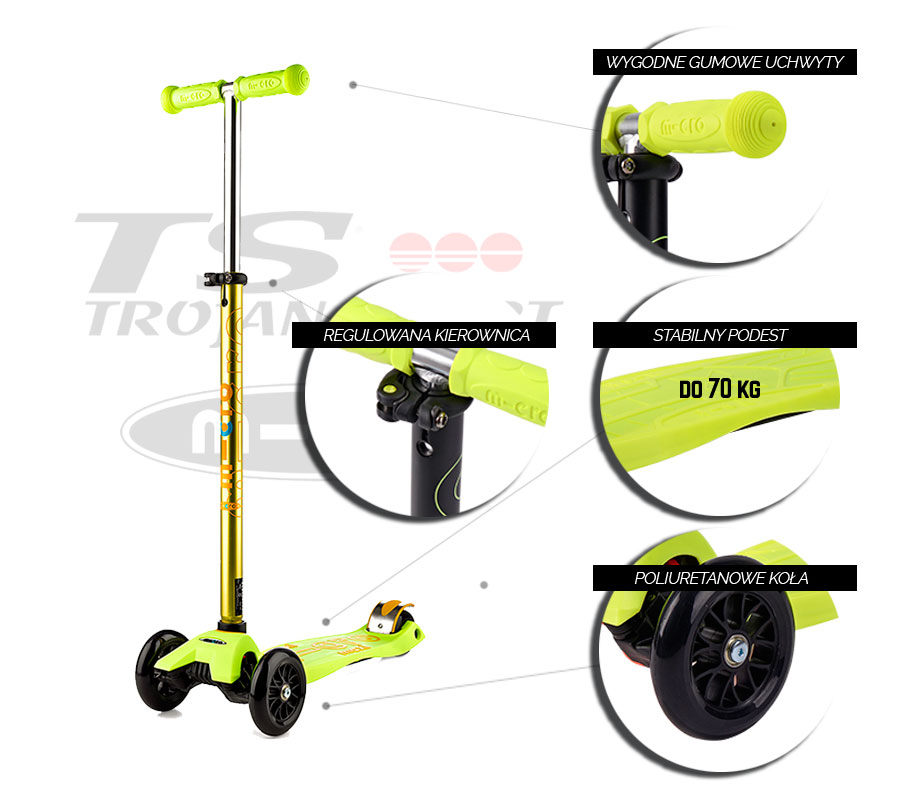 maxi micro deluxe hulajnog - это улучшенная версия бестселлера Maxi из известной швейцарской компании Micro. В светодиодной версии Deluxe он получил светящиеся передние колеса. Специальная, усиленная платформа теперь выдерживает до 70 кг. Так что это оптимальное решение для детей, слишком большого для мини -микро -микросхемы и тех, кто выращивает из Mini Micro и хочет скутеров «в течение многих лет». Maxi, как и Micro, доступна в широком спектре цветов. Идея поставить два колеса на передней части автомобиля и повесить платформу рядом с землей, делает Maxi Micro Deluxe чрезвычайно стабильным и безопасным для ребенка. Уникальный механизм скручивания помогает развить чувство баланса у детей и учит баланса тела. Основное отличие по сравнению с «классической» мини -микро -моделью - это регулируемый рулевой колесо.