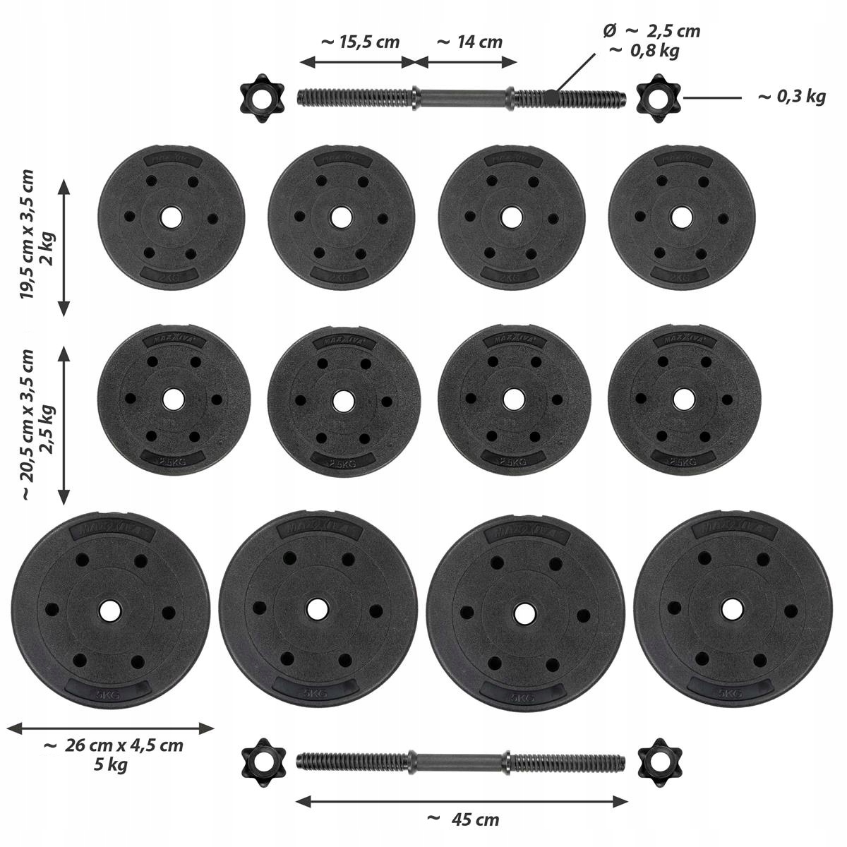 Комплект гантелей MAXXIVA® общим весом 40 кг (2 × 20 кг) — практичное решение для людей, занимающихся силовыми тренировками дома. Оно позволяет тренировать многие группы мышц – руки, грудь, спину, ноги и мышцы живота.