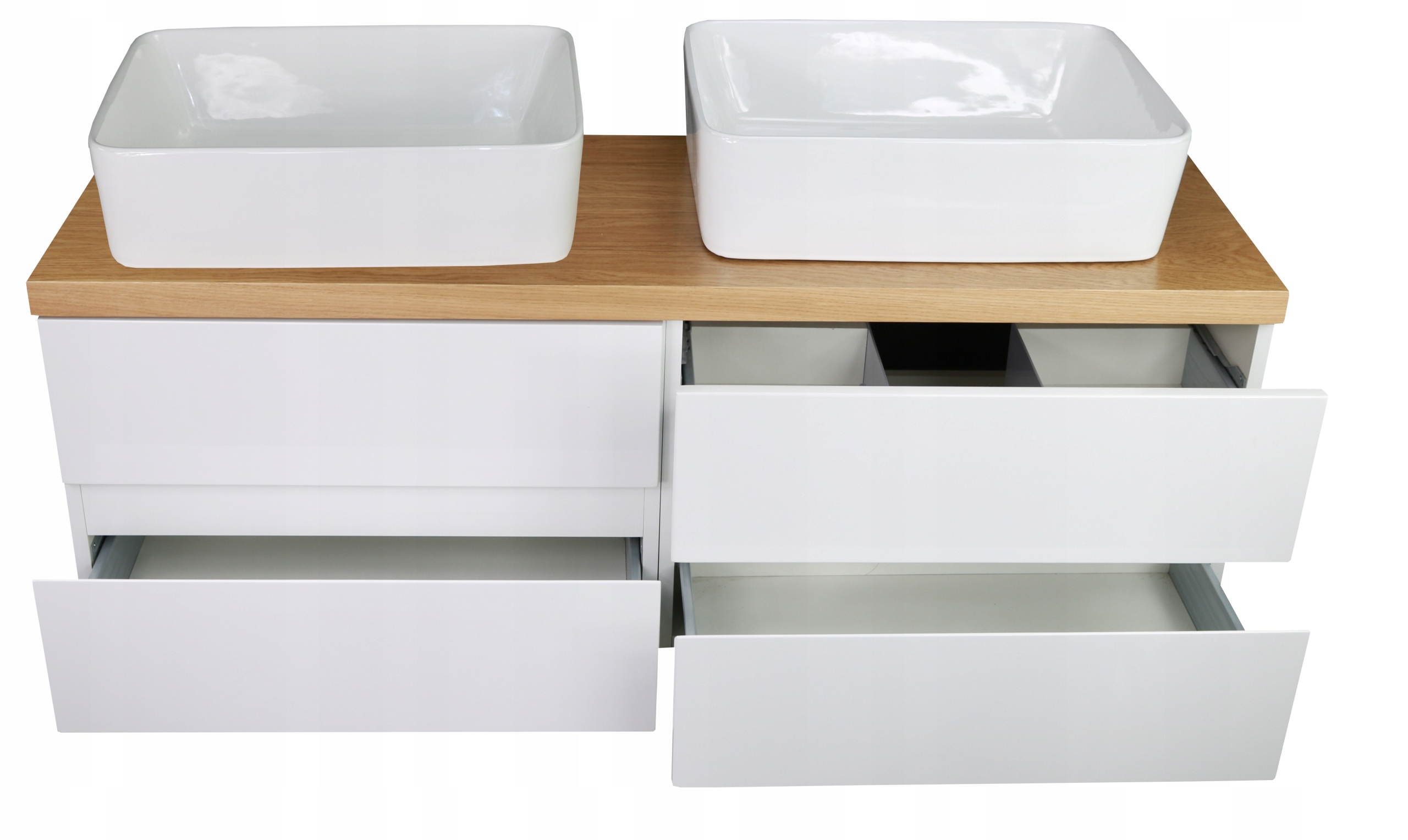 Складка подвесной ванной комнаты для раковины с деревянной дубовой топом! Верхняя раковина. Поверхность покрыта маслом с обеих сторон, чтобы защитить от влаги. Изготовлен из толстой и прочной пластины (38 мм). В идеале подходит для каждой ванной комнаты, давая ему персонаж. .. Тихая система закрытия, которая заставляет ящик замедляться в последнем этапе закрытия, а затем закрывается напрямую. Фронты, изготовленные из MDF, что делает их долговечными и устойчивыми к вредной воде, и дезинфицирующие средства. Стоит обратить внимание на это при покупке мебели для ванной комнаты, чтобы служить много лет