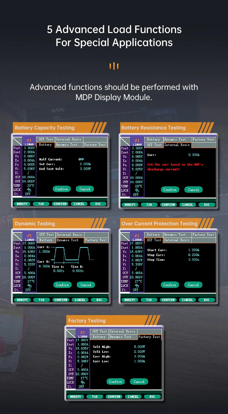 Он оснащен интеллектуальными функциями защиты, такими как: защита от короткого замыкания (OVP), защита от низкого напряжения (UVP), защита от перегрузки по току (OCP), защита от перегрузки (OPP), защита от перегрева (OTP), защита от обратной полярности (Anti-Reverse) и другие функции защиты, что делает ее универсальный инструмент, способный тестировать различные сценарии, такие как: источники питания, преобразователи постоянного тока в постоянный, зарядные устройства, аккумуляторы, адаптеры и силовые электронные компоненты.