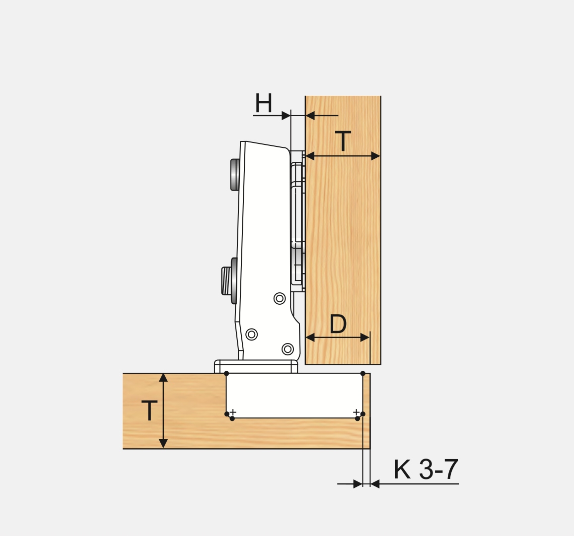 Если таких отверстий нет, нам также понадобится дрель с фрезой по дереву 35 мм, рулетка и карандаш. Чтобы правильно измерить монтажные отверстия, ознакомьтесь с техническим чертежом петли и установочными размерами коробки и направляющей(чертежи ниже).