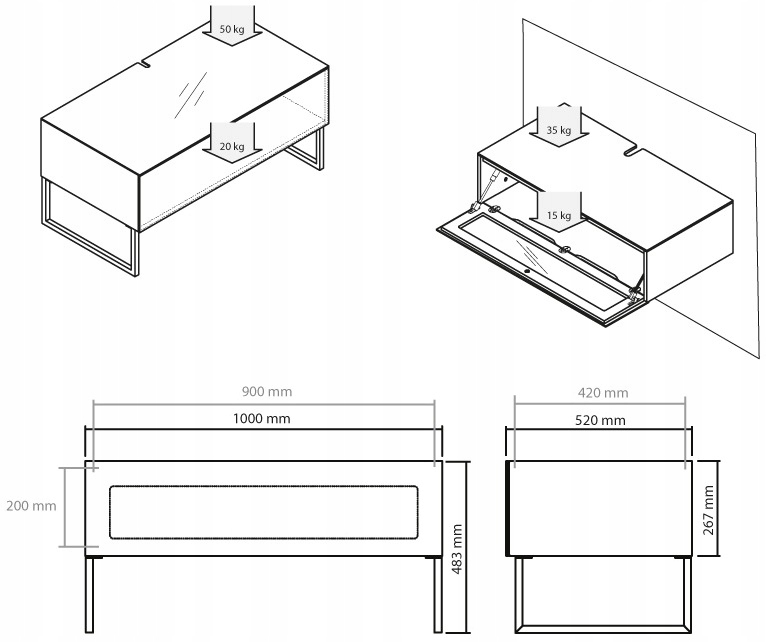 - Полка Б: подвесная; верхняя полка 35 кг, нижняя полка 15 кг.