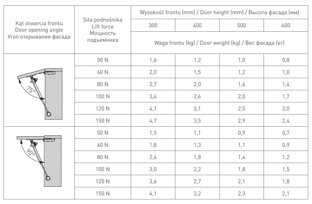 Газлифт предназначен для шкафов с открывающимися вверх фасадами. Обеспечивает ликвидность и амортизацию при открытии и закрытии шкафов. Его механизм предотвращает инертное падение передней панели, а технология бесшумного закрытия еще больше улучшает ее использование, замедляя переднюю часть при закрытии. Он изготовлен из стали и может использоваться на фасадах высотой до 600 мм. Подъемник обеспечивает угол открытия фасада в диапазоне 75°-90°. Требуются петли.
