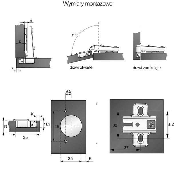 На техническом чертеже указан максимальный угол открытия фасада и диаметр отверстия (стандартно 35 мм) для чашки петли.